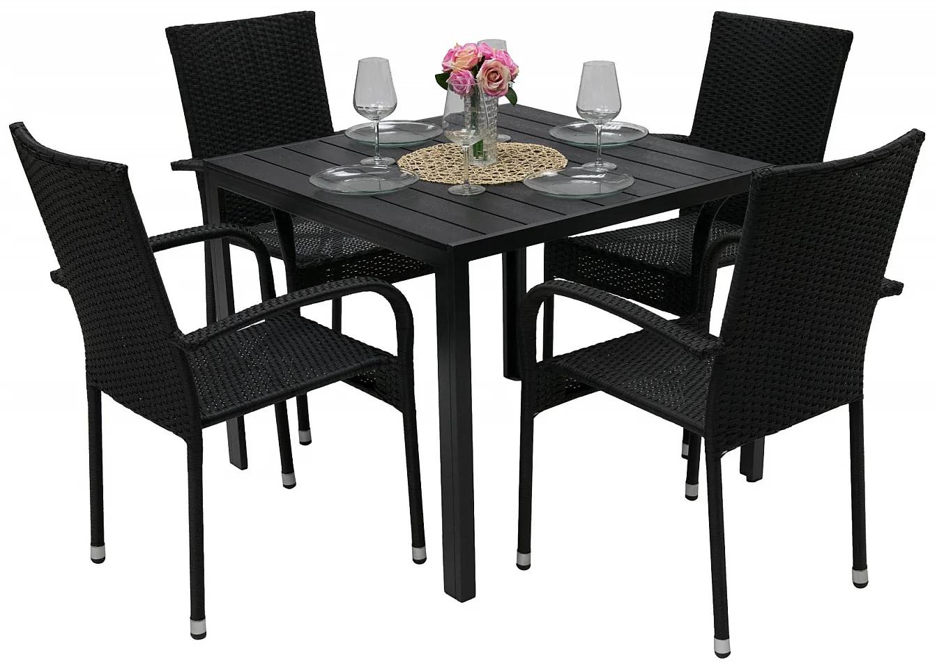 Vyberte si nové záhradné posedenie online z pohodlia domova! Preskúmajte všetky záhradné zostavy z umelého ratanu a urobte si radosť kvalitným záhradným nábytkom. Sestava obsahuje: 4x Ratanové kreslo stohovateľné SIENA (čierna), 1x Hliníkový stôl TRENTO 90 x 90 cm