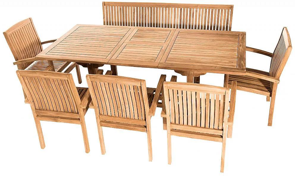 Aj napriek tomu sa jedná o odolný prírodný materiál, odporúčame nábytok raz ročne impregnovať teakovým olejom (viď príslušenstvo). Sestava obsahuje: 1x Záhradný obdĺžnikový stôl MONTANA 160/210 x 90 cm (teak), 1x Záhradná teaková lavica HARMONY 180 cm, 5x Záhradné pevné kreslo HARMONY (teak)