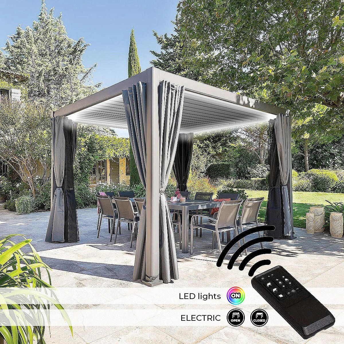 Pergola je vybavená elektrickou lamelovou strechou, ktorá sa dá otáčať pomocou diaľkového ovládača a prepúšťať alebo filtrovať svetlo. Ideálne riešenie pre tých, ktorí chcú veľký priestor na vonkajšie posedenie.