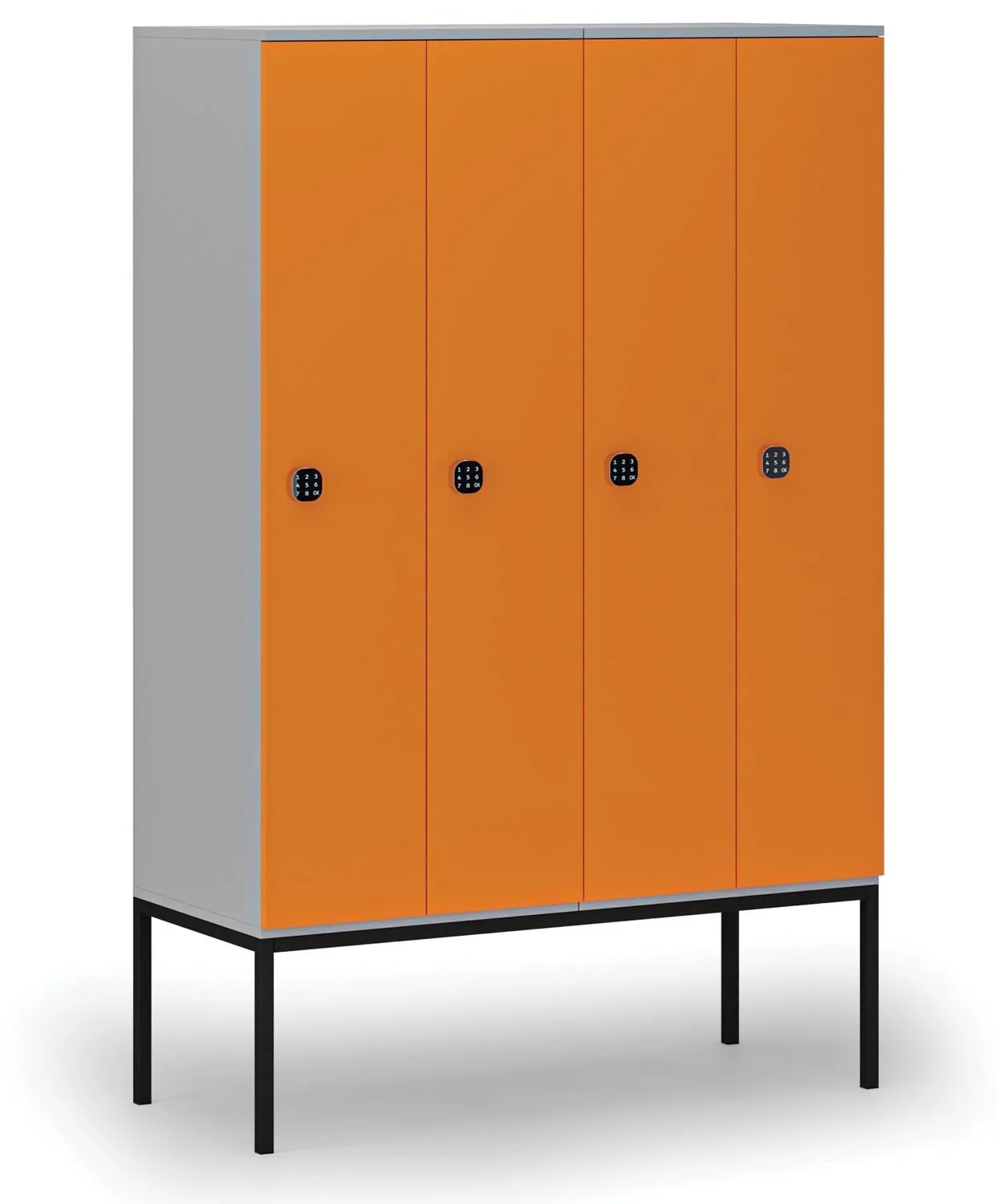 Drevená šatníková skriňa na nôžkach pochádza z našej vlastnej produkcie. Zamerali sme sa predovšetkým na funkčnosť a bezpečnosť. Rohy sú olepené ABS plastovou hranou. Skrini nechýba ventilácia, ktorá je zaistená otvormi v zadnej stene. Drevenú šatníkovú skriňu vyrábame v deviatich odtieňoch a farebných dezénoch: breza, buk, čerešňa, orech, oranžová, zelená, červená, modrá, grafit. Voliť môžete medzi piatimi variantmi zámkov: cylindrický, otočný, elektronický kódový, mechanický kódový, RFID. · skriňa na kovovej šedej podnoži · steny a dvere sú z laminovanej drevotriesky, rohy sú olepené ABS plastovou hranou · päť variant zámkov na výber: cylindrický, otočný, elektronický kódový, mechanický kódový, RFID · súčasťou balenia je dvojháčik a jedna polica · ventilácia je zaistená otvormi v zadnej stene · dvierka sú osadené tromi kovovými závesmi · dodávané v demontovanom stave (rýchla a jednoduchá montáž)