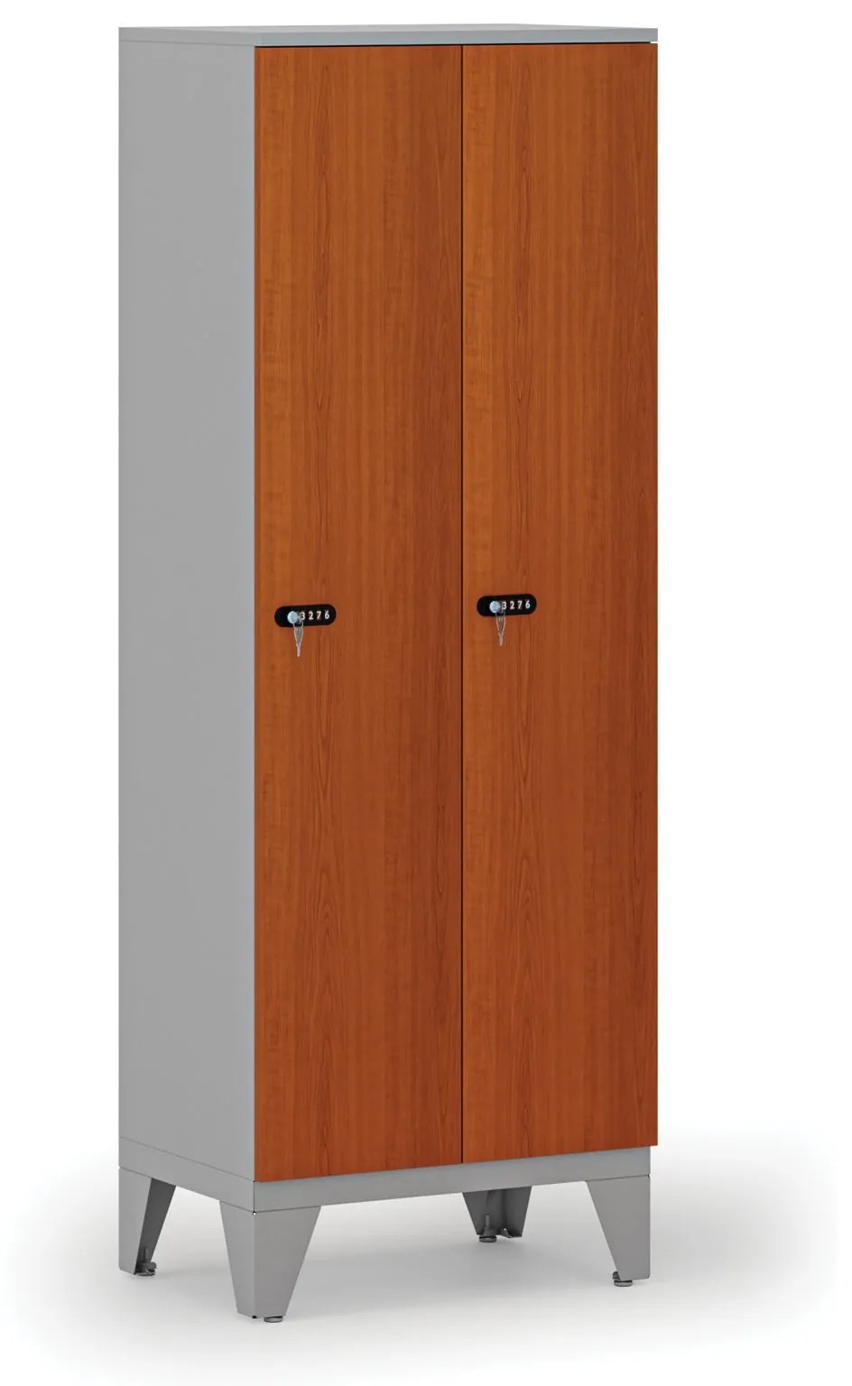 Drevená šatníková skriňa na nôžkach pochádza z našej vlastnej produkcie. Zamerali sme sa predovšetkým na funkčnosť a bezpečnosť. Rohy sú olepené ABS plastovou hranou. Skrini nechýba ventilácia, ktorá je zaistená otvormi v zadnej stene. Drevenú šatníkovú skriňu vyrábame v deviatich odtieňoch a farebných dezénoch: breza, buk, čerešňa, orech, oranžová, zelená, červená, modrá, grafit. Voliť môžete medzi piatimi variantmi zámkov: cylindrický, otočný, elektronický kódový, mechanický kódový, RFID. · skriňa na kovovej šedej podnoži · steny a dvere sú z laminovanej drevotriesky, rohy sú olepené ABS plastovou hranou · päť variant zámkov na výber: cylindrický, otočný, elektronický kódový, mechanický kódový, RFID · súčasťou balenia je dvojháčik a jedna polica · ventilácia je zaistená otvormi v zadnej stene · dvierka sú osadené tromi kovovými závesmi · dodávané v demontovanom stave (rýchla a jednoduchá montáž)