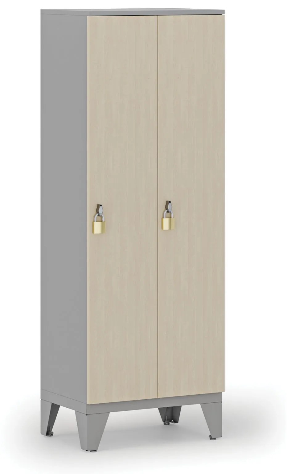 Drevená šatníková skriňa na nôžkach pochádza z našej vlastnej produkcie. Zamerali sme sa predovšetkým na funkčnosť a bezpečnosť. Rohy sú olepené ABS plastovou hranou. Skrini nechýba ventilácia, ktorá je zaistená otvormi v zadnej stene. Drevenú šatníkovú skriňu vyrábame v deviatich odtieňoch a farebných dezénoch: breza, buk, čerešňa, orech, oranžová, zelená, červená, modrá, grafit. Voliť môžete medzi piatimi variantmi zámkov: cylindrický, otočný, elektronický kódový, mechanický kódový, RFID. · skriňa na kovovej šedej podnoži · steny a dvere sú z laminovanej drevotriesky, rohy sú olepené ABS plastovou hranou · päť variant zámkov na výber: cylindrický, otočný, elektronický kódový, mechanický kódový, RFID · súčasťou balenia je dvojháčik a jedna polica · ventilácia je zaistená otvormi v zadnej stene · dvierka sú osadené tromi kovovými závesmi · dodávané v demontovanom stave (rýchla a jednoduchá montáž)