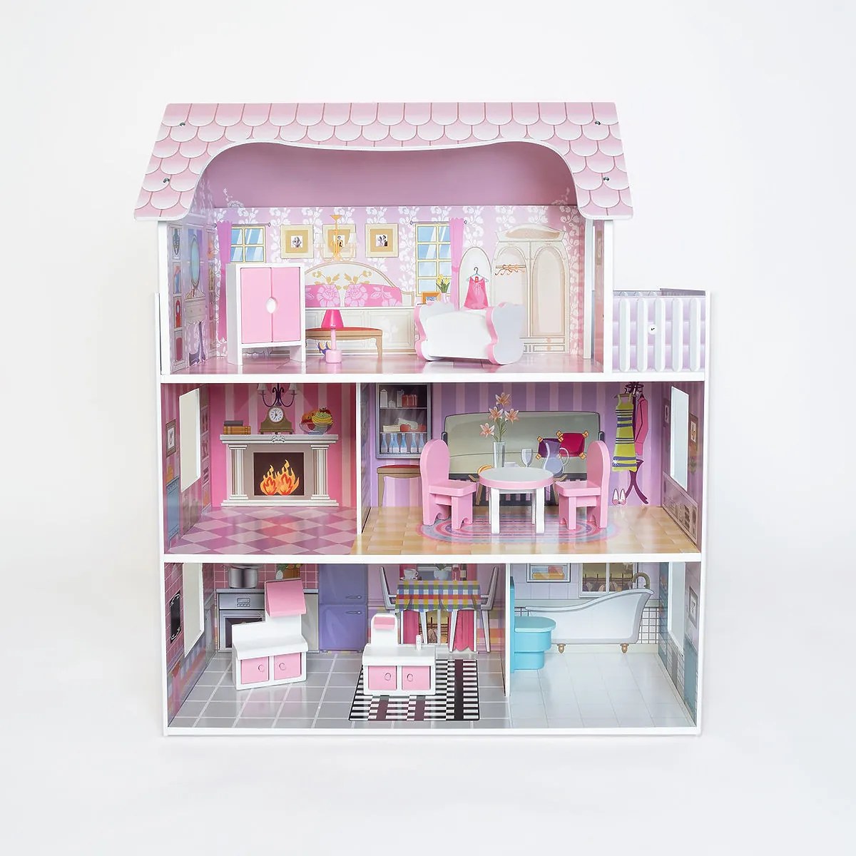 Tento krásny, drevený domček Bella bezpochyby poteší každú mladú slečnu. V tejto trojposchodovej rezidencii sa nachádza päť samostatných izieb, terasa a osem kusov dreveného nábytku, ktorý je možné ľubovoľne presúvať.