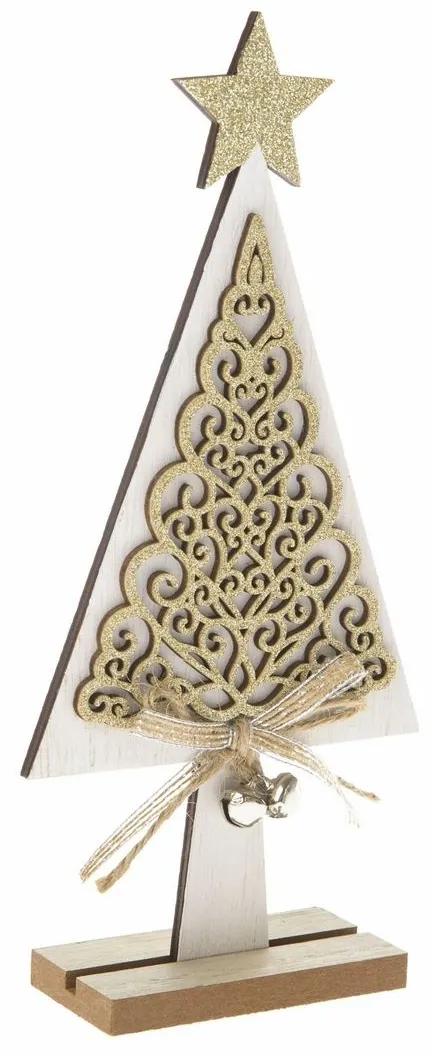 Zaujímavá dekorácia dreveného stromčeka s vyrezávanými detailmi bude skvele vyzerať v akomkoľvek interiéri. Na špičke má trblietavú hviezdu, kmeň je ozdobený dvoma malými rolničkami. Dekorácia stojí na drevenom podstavci.