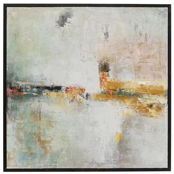 Abstraktný obraz Dust v pestrých odtieňoch zasadený do čierneho rámu z masívnej borovice.