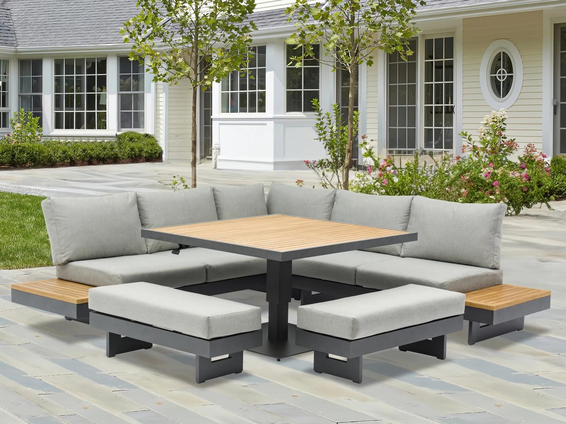 Luxusná rohová stolová súprava Eloise je navrhnutá v zaujímavom dizajne s možnosťou zníženia alebo zvýšenia stola.
