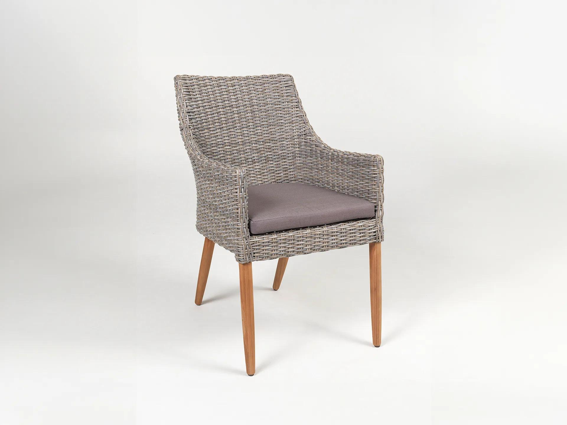 Elegantné záhradné ratanové kreslo Faro s hliníkovou konštrukciou, pohodlným podsedákom a nohami z agátového dreva si určite zamilujete.
