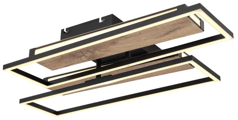 Stropné svietidlo, kov/hliník čierny matný, MDF so vzhľadom dreva, plast opál, niekoľko úrovní cez nástenný vypínač, pam. funkcia, otočné, 3 úrovne: 1.hlavné svetlo, 2.LED v ráme, 3.obe spolu, DxŠxV: 600x520x120mm, 2x LED 24W 230V 1500lm výstup,3000K