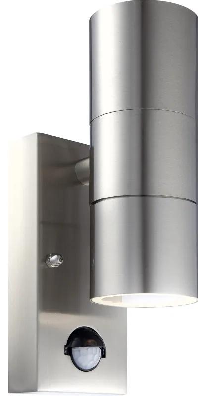 Vonkajšie svietidlo, nerezová oceľ, čsklo priehľadné, IP44, senzor: 100°; dosah: 6m, ŠxV: 70×215, H: 110, vrátane žiaroviek 2xGU10 5W 230V, 420lm, 3000K.