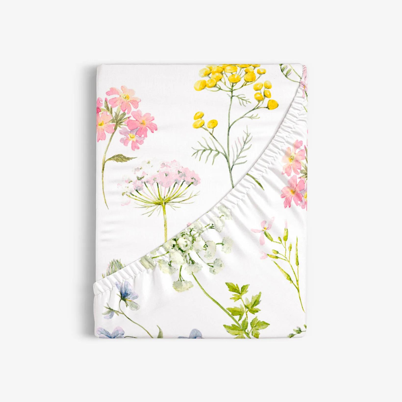 Motív kvitnúcich farebných kvetín vykúzli vo Vašej spálni pokojnú a ničím nerušenú atmosféru pre čo najlepší odpočinok. Táto bavlnená plachta (s napínacou gumou) je vyrobená zo 100% hladkej bavlny o gramáži 145 g/m 2 . Podkladom plachty je biela farba.