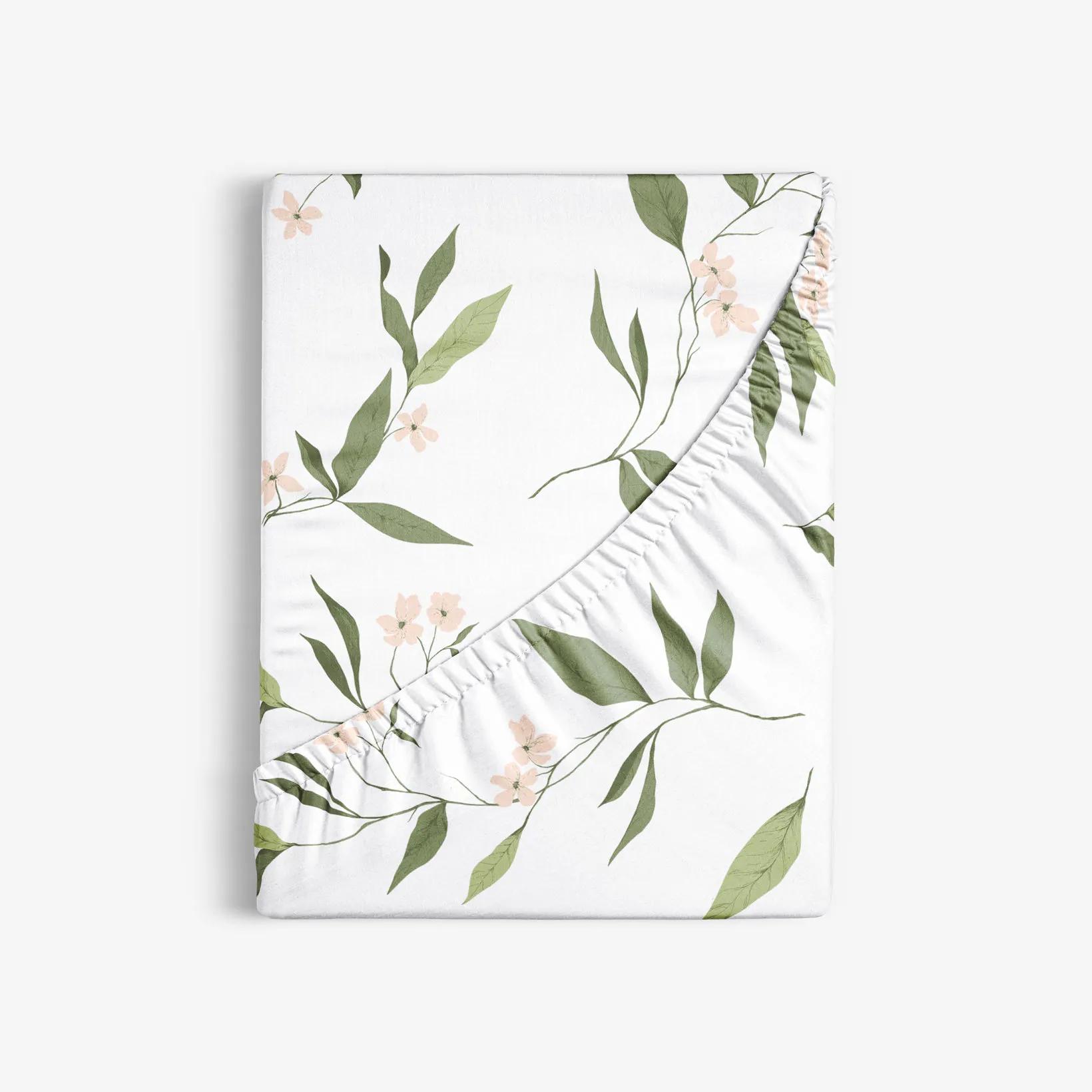 Motívom vône jazmínu navodíte vo Vašej spálni pokojnú a ničím nerušenú atmosféru pre čo najlepší oddych. Táto bavlnená plachta (s napínacou gumou) je vyrobená zo 100% hladkej bavlny o gramáži 145 g/m2. Podkladom plachty je biela farba.