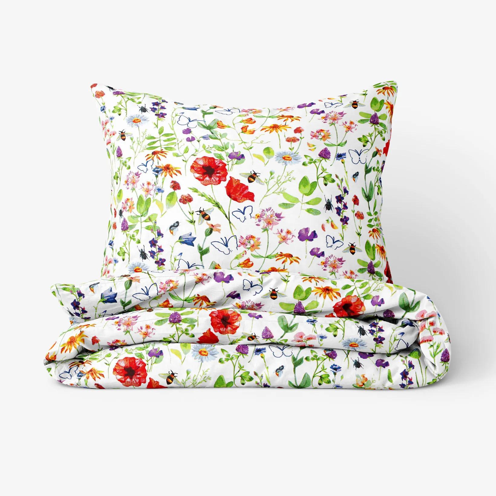 Motív vlčích makov, motýľov, chrobákov a včiel vnesie do Vašej spálne pohodovú a uvoľnenú atmosféru pre ničím nerušený spánok. Tieto bavlnené obliečky sú vyrobené zo 100% hladkej bavlny o gramáži 145 g/m 2 . Podkladom obliečok je biela farba.