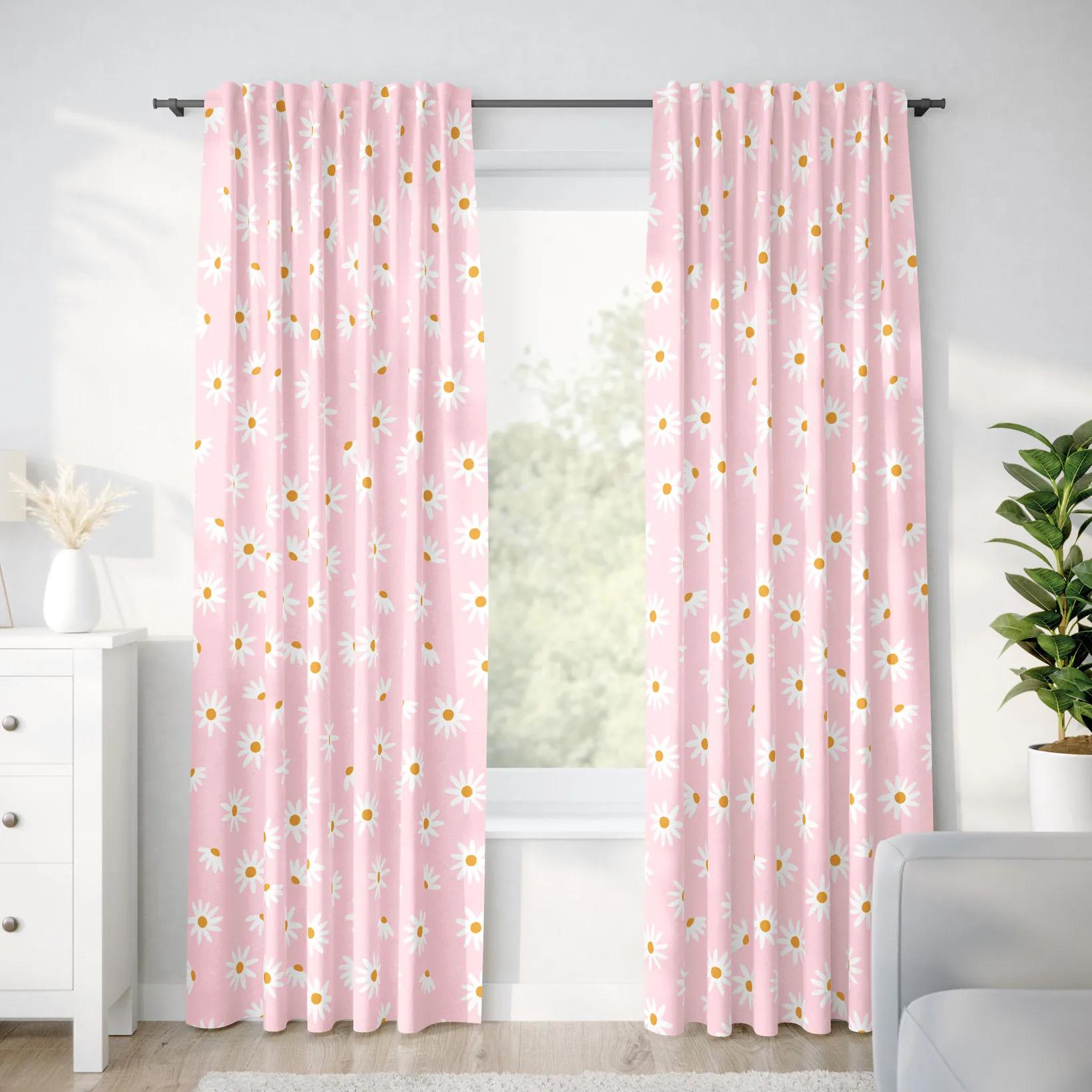 Bavlnený záves s motívom margarétok na ružovom podklade. Tento záves šijeme z bavlneného plátna – kvety margarétok o gramáži 145g/m2. Ide o husto tkané plátno zložené zo 100% bavlny. Záves má kvalitný jednostranný potlač a je výhradne určený na dekoračné účely (miestnosť zatieni, ale nezatemní).
