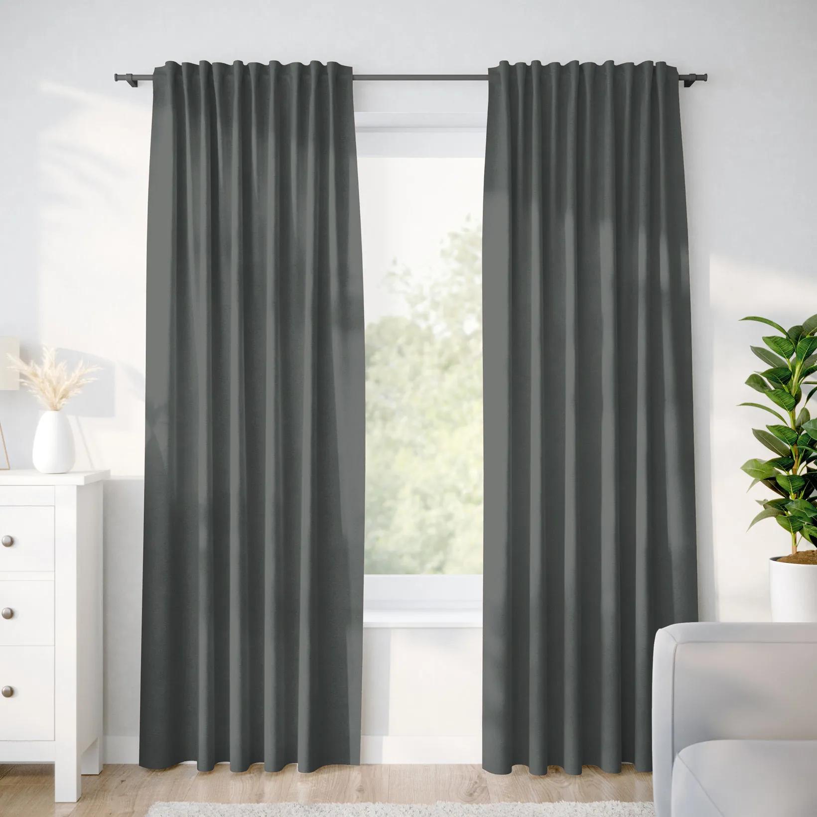 Dekoračný záves Loneta v antracitovom prevedení. Tento záves šijeme zo španielskej dekoračnej látky Loneta – vzor FIUME C-809 o gramáži 190g/m2. Záves z tejto látky je obojstranný (rovnaké farebné prevedenie z oboch strán), pevný a určený na dekoračné účely (miestnosť zatieni, ale nezatemní).
