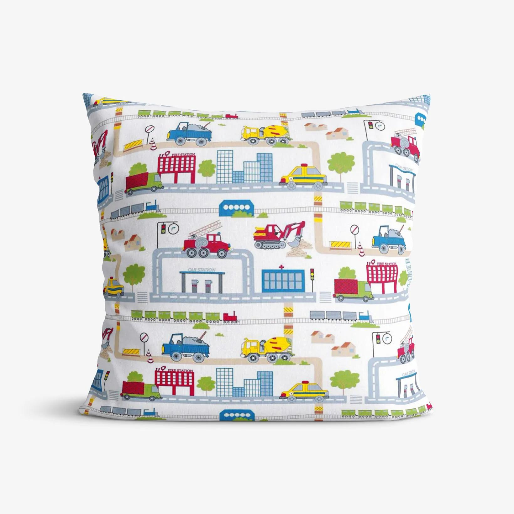 Bavlnená obliečka na vankúš s motívom autíčok v meste na bielom podklade (z oboch strán rovnaký motív). Obliečka je vyrobená z kvalitnej a príjemnej 100% bavlny. Je vybavená praktickým zapínaním na zips. Možné prať na 40°C.