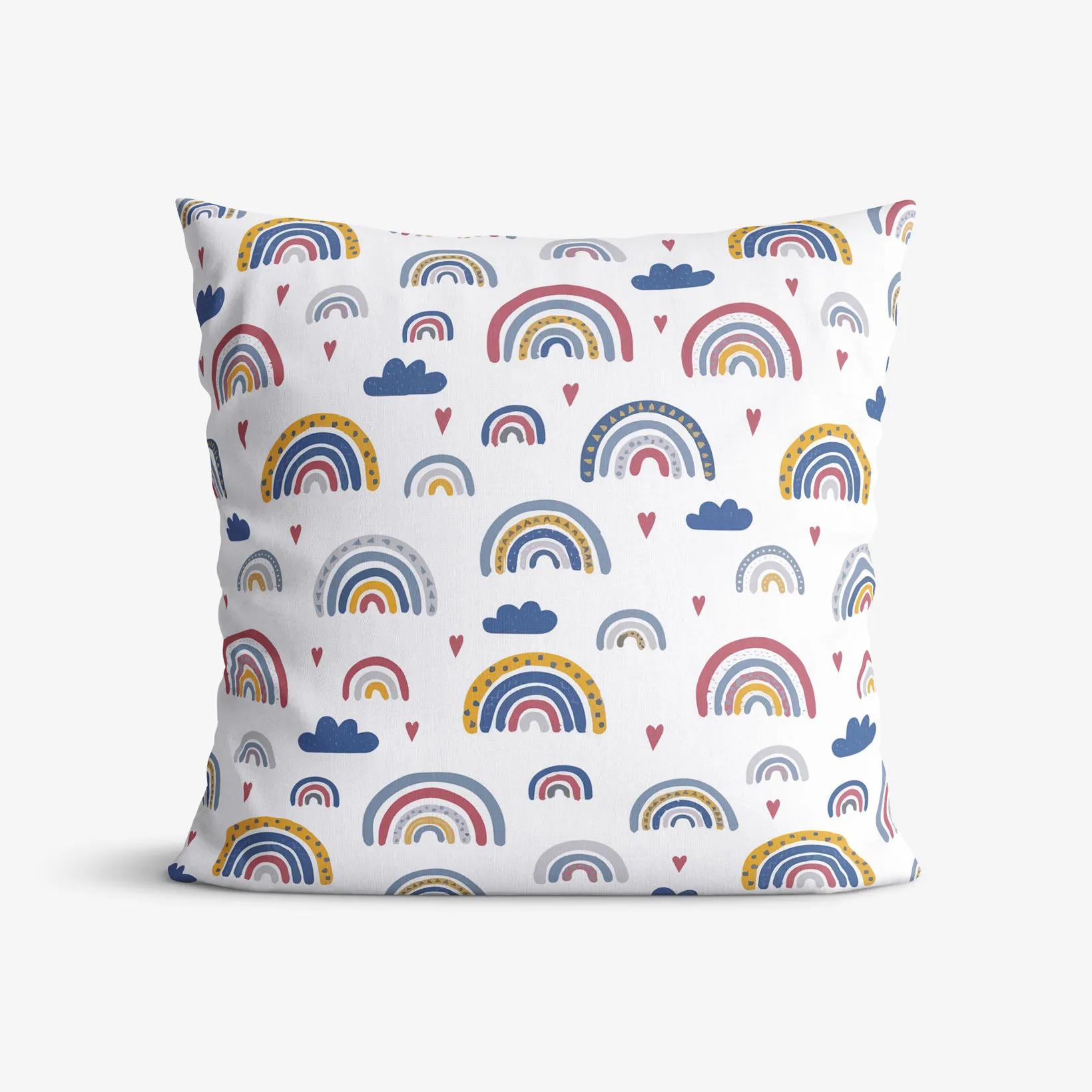 Bavlnená obliečka na vankúš s motívom farebných dúh, srdiečok a mráčikov na bielom podklade (z oboch strán rovnaký motív). Obliečka je vyrobená z kvalitnej a príjemnej 100% bavlny. Je vybavená praktickým zapínaním na zips. Možné prať na 40°C.