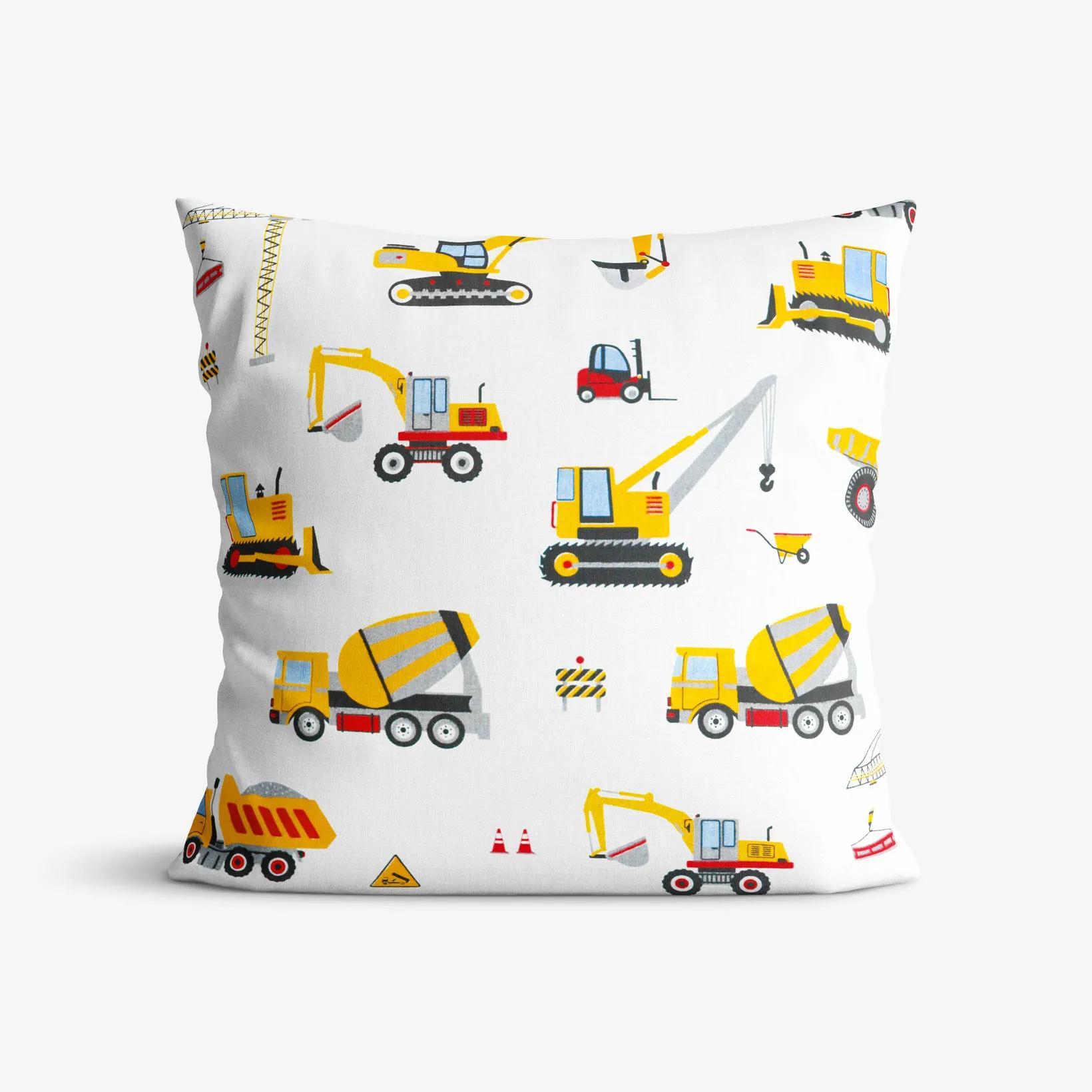 Bavlnená obliečka na vankúš s motívom nákladných áut a bagrov na bielom podklade (z oboch strán rovnaký motív). Obliečka je vyrobená z kvalitnej a príjemnej 100% bavlny. Je vybavená praktickým zapínaním na zips.