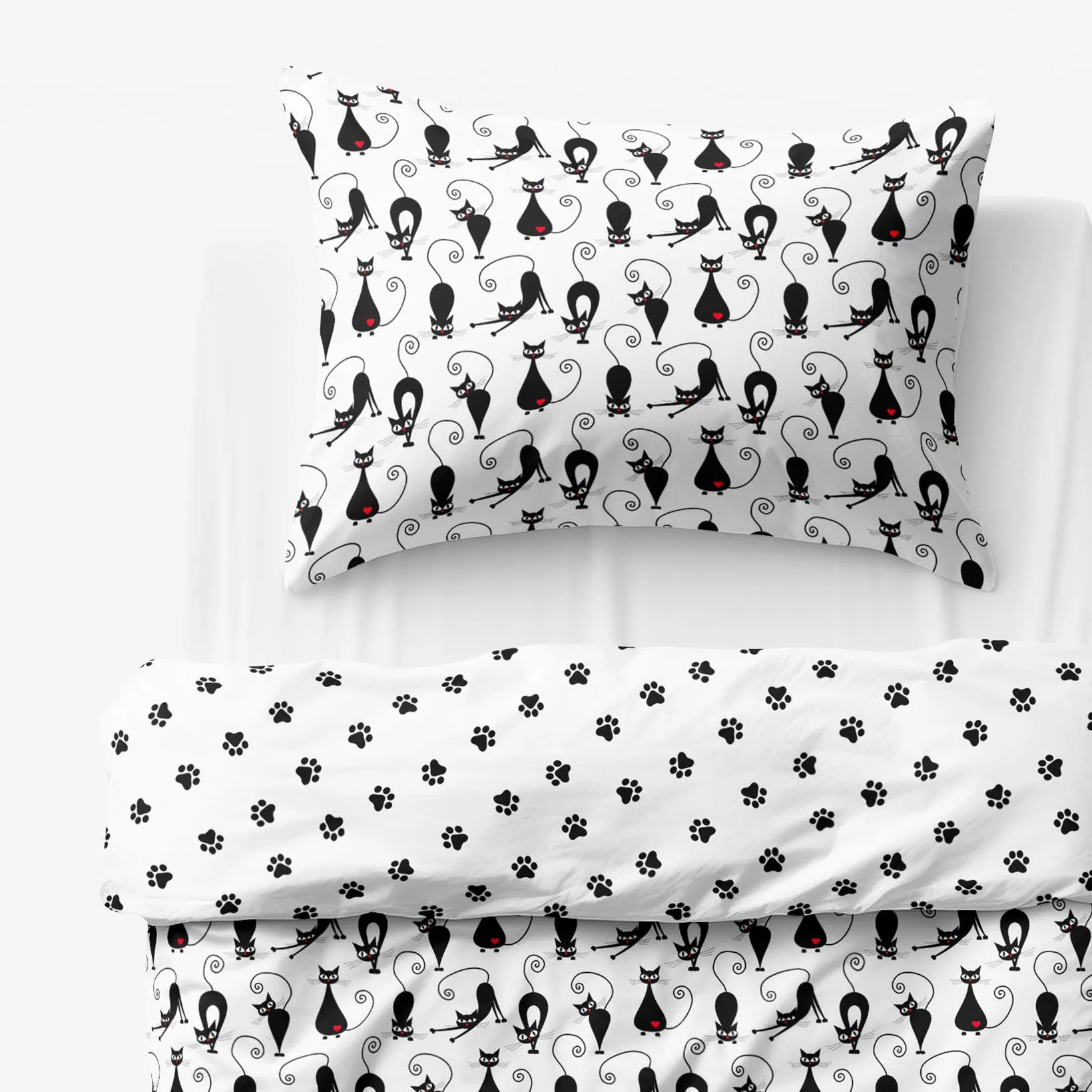 Obojstranné obliečky do postele, ktoré majú z jednej strany motív čiernych mačiek a zo druhej strany motív čiernych labiek, budú tou najlepšou voľbou pre Vaše malé deti. Podkladom je biela farba. Sú ušité z kvalitnej a hladkej 100% bavlny o gramáži 145 g/m 2 .