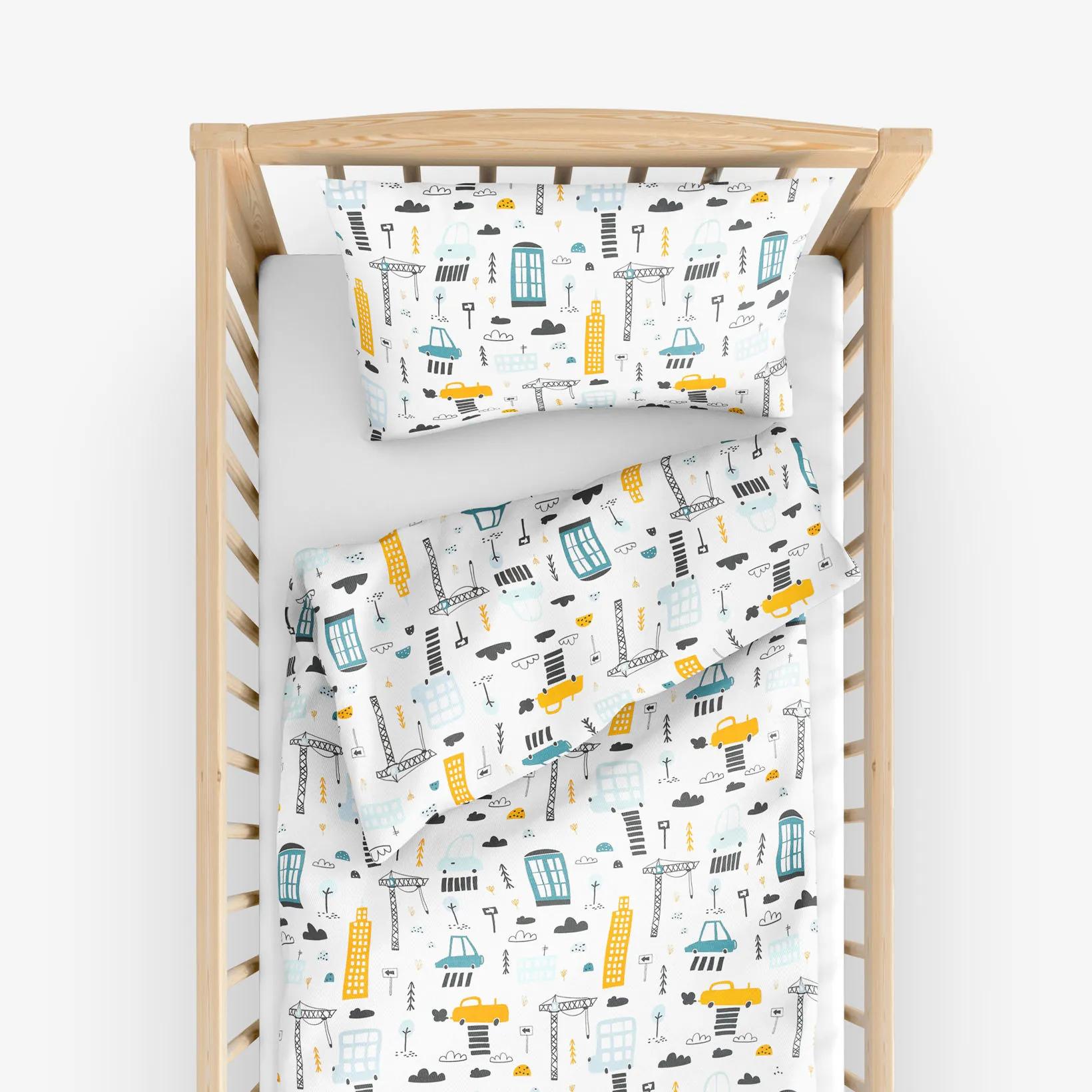 Obliečky s motívom áut, žeriavov a budov vyčarí úsmev na tvári Vašim deťom a budú krásnou ozdobou izbičky. Podkladom obliečok je biela farba. Sú ušité z kvalitnej a hladkej 100% bavlny o gramáži 145 g/m2.