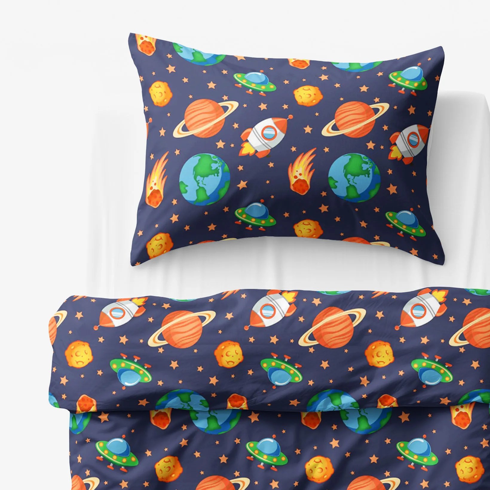 Detské obliečky pre odvážnych dobyvateľov neznámych galaxií. Zelení ufúni sú vám v pätách, ale vaša raketa letí na najvyšší pohon. Z nej uvidíte ostatné planéty ako na dlani a rodičom môžete dole na Zemi veselo zamávať. Ale teraz treba spať, aby vám nedošlo palivo.