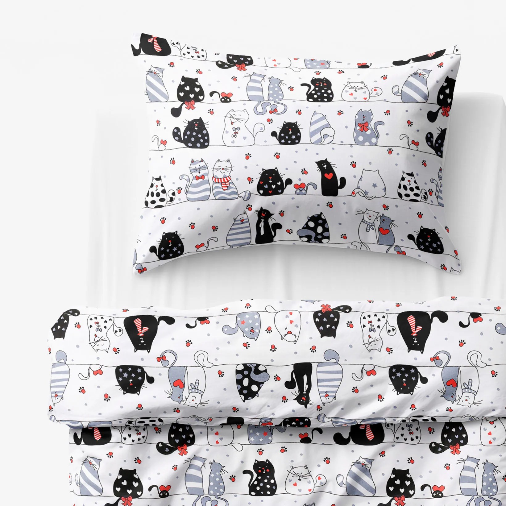 Detské obliečky pre milovníkov mačacieho sveta . Roztomilé čierne, biele a sivé mačiatka a nezbední kocúrkovia v dlhých radoch obsadili celú perinu a ešte všade zanechali svoje ťapky. Než nájdete s deťmi tú naozaj najroztomilejšiu alebo najsmiešnejšiu mačku, zaspia vám stočenia do klbka.