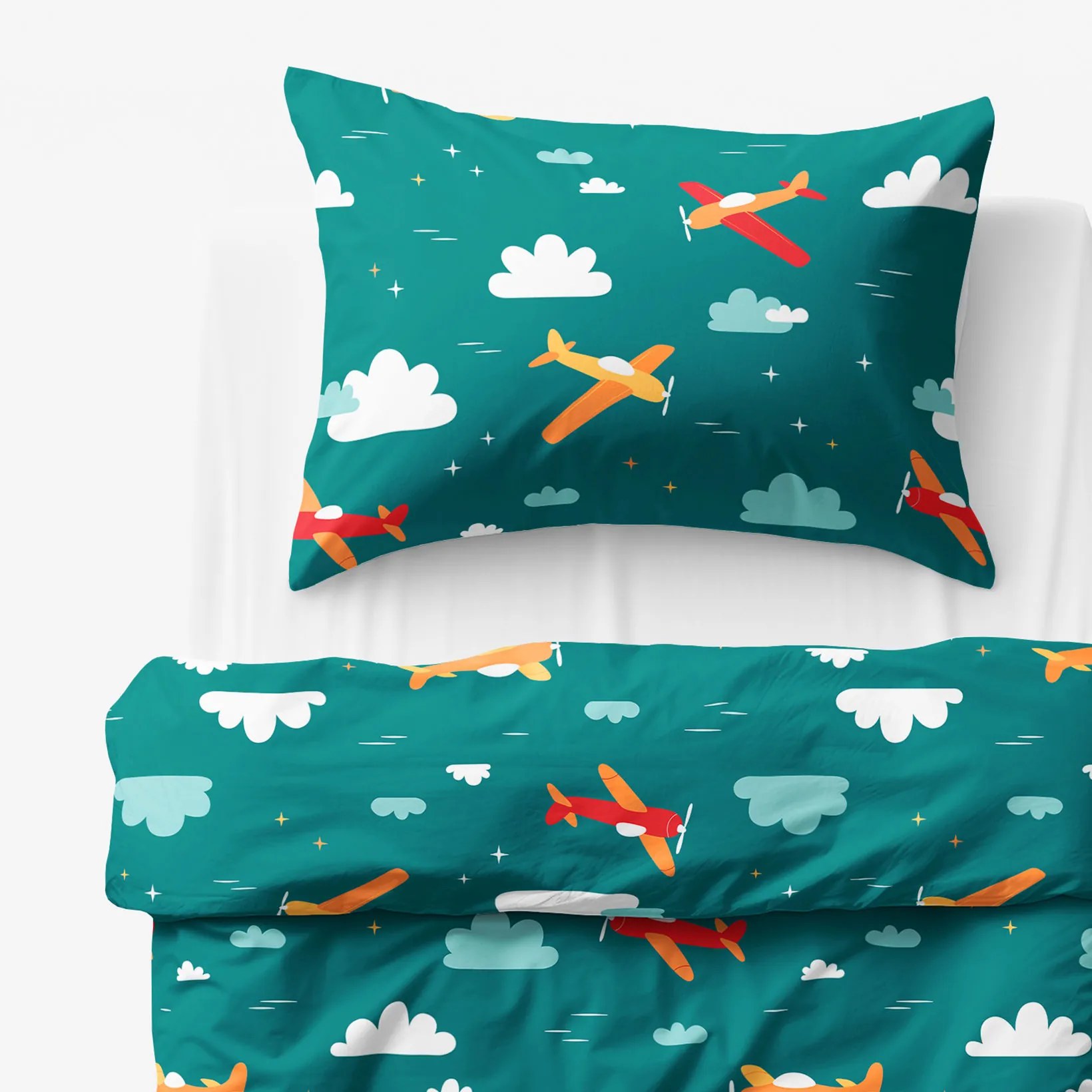 Obliečky s motívom farebných lietadiel vyčarí úsmev na tvári všetkým budúcim pilotom. Tieto bavlnené obliečky sú vyrobené zo 100% hladkej bavlny o gramáži 145 g/m2. Podkladom obliečok je petrolejová farba.