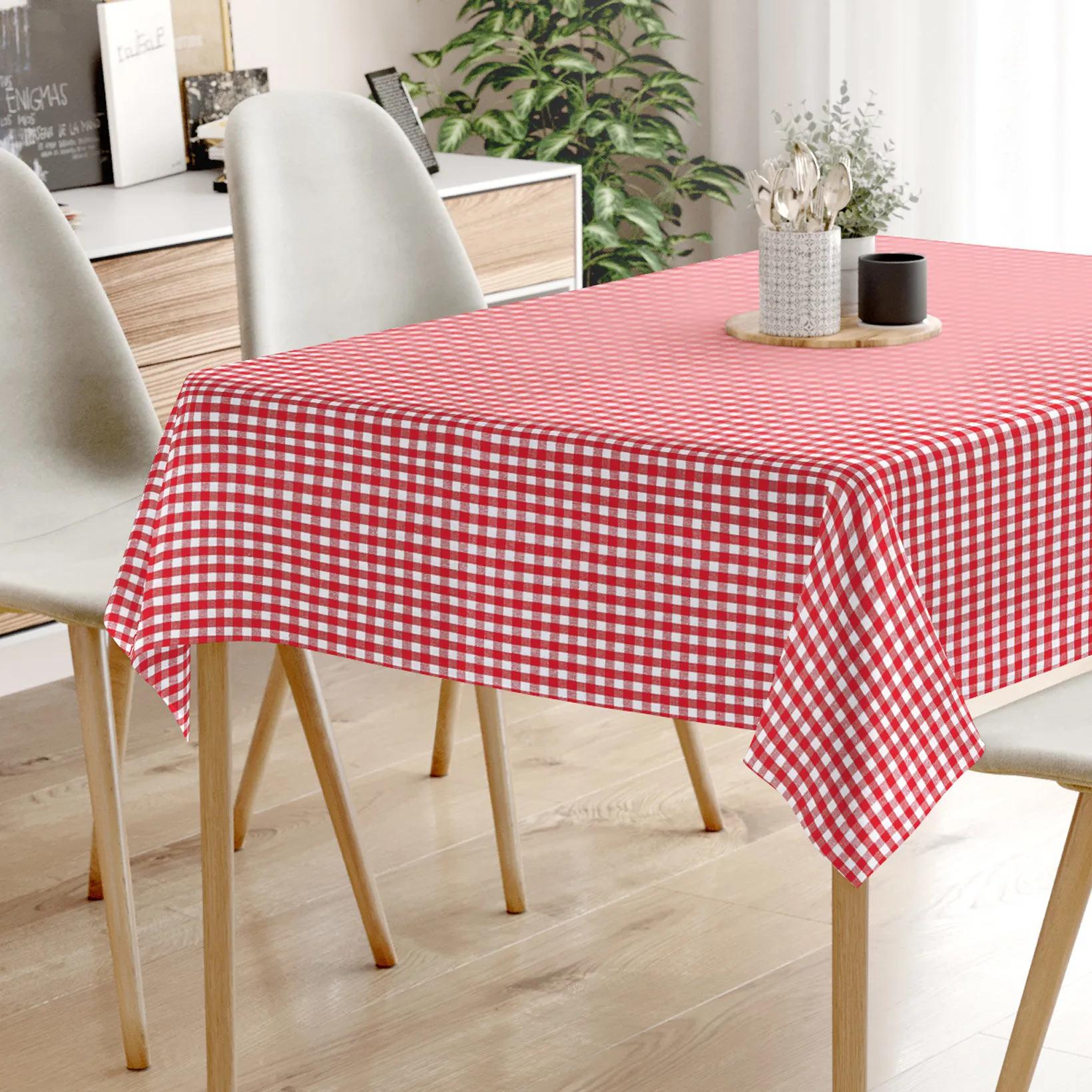 Bavlnený obrus s motívom malých červeno-bielych kociek. Je vyrobený z pestro tkanej farbenej priadze (100% bavlna) s gramážou 230g/m2. Obrus veľmi dobre drží tvar a hodí sa na akýkoľvek hranatý stôl. Obrus s motívom kociek dokonale skrášli Váš interiér.