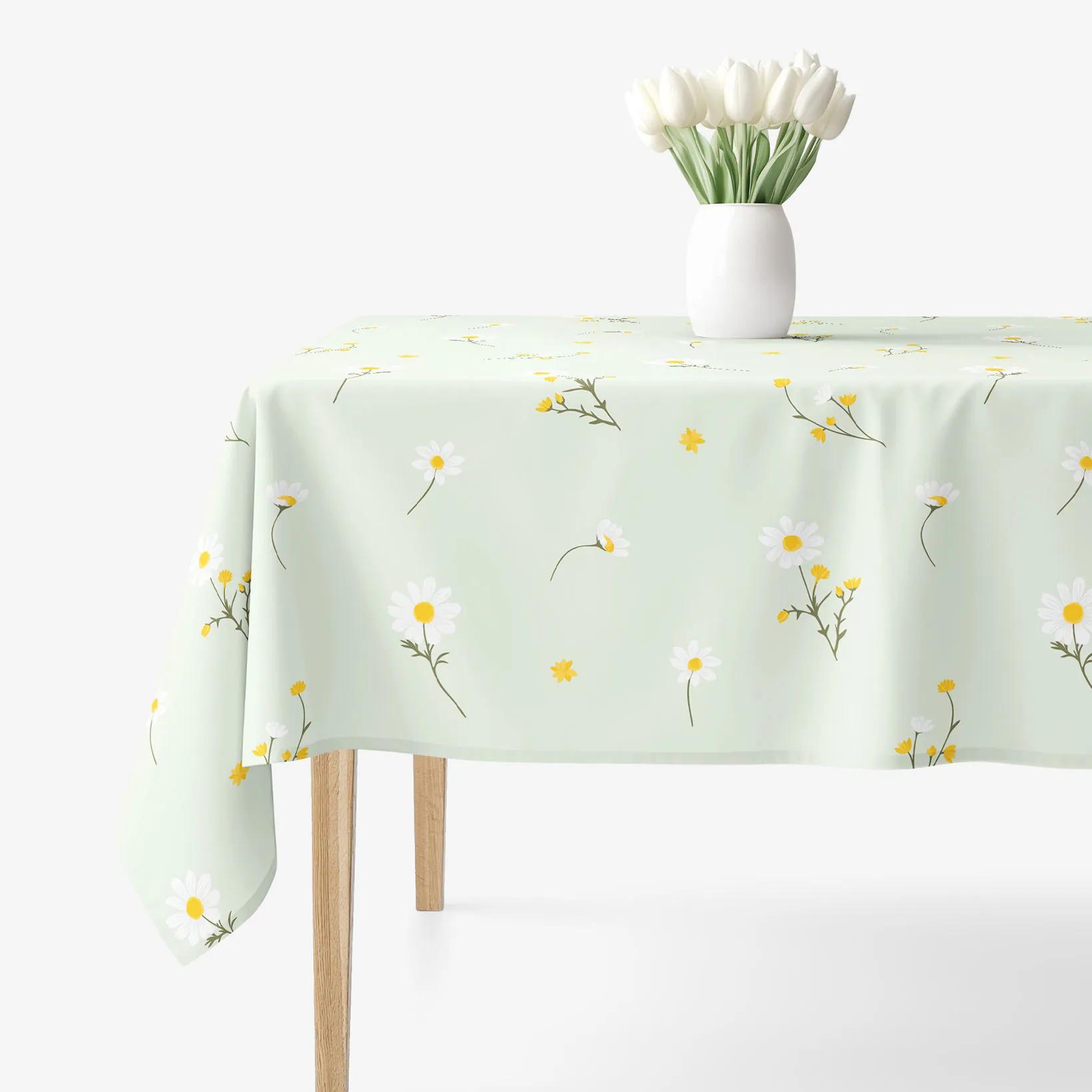 Bavlnený obrus s motívom harmančeka na svetlo zelenom podklade. Je vyrobený z veľmi kvalitnej 100% bavlny (gramáž 145g/m2). Obrus veľmi dobre drží tvar a hodí sa na akýkoľvek hranatý stôl. Obrus s motívom harmančeka dokonale skrášlia Váš interiér.