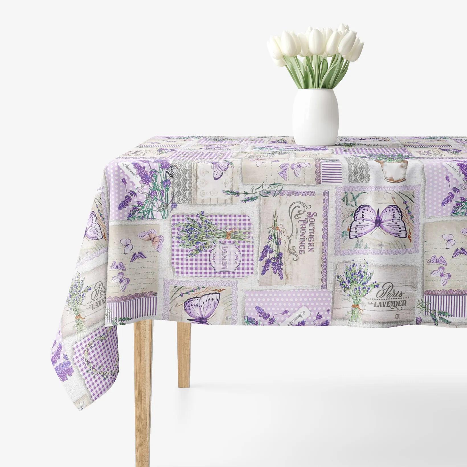 Bavlnený obrus s patchworkom levanduľou s motýľmi. Je vyrobený z veľmi kvalitnej 100% bavlny (gramáž 145g/m2). Obrus veľmi dobre drží tvar a hodí sa na akýkoľvek hranatý stôl. Obrus s patchworkom levanduľou s motýľmi dokonale skrášli Váš interiér.