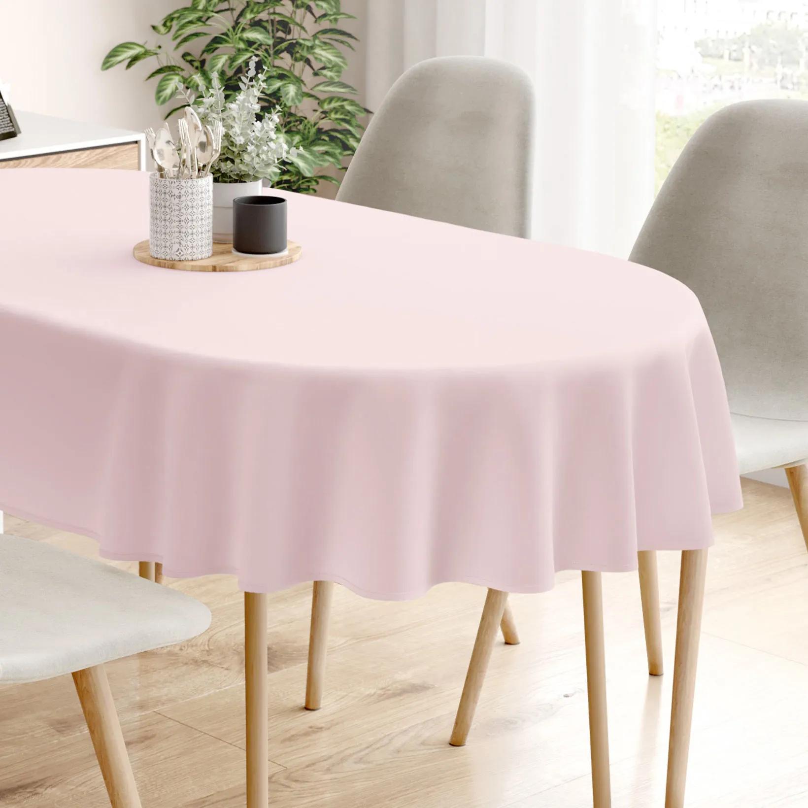 Púdrovo ružový oválny obrus vyrobený zo 100% bavlneného plátna o gramáži 145g/m2. Obrus je po celom obvode olemovaný.