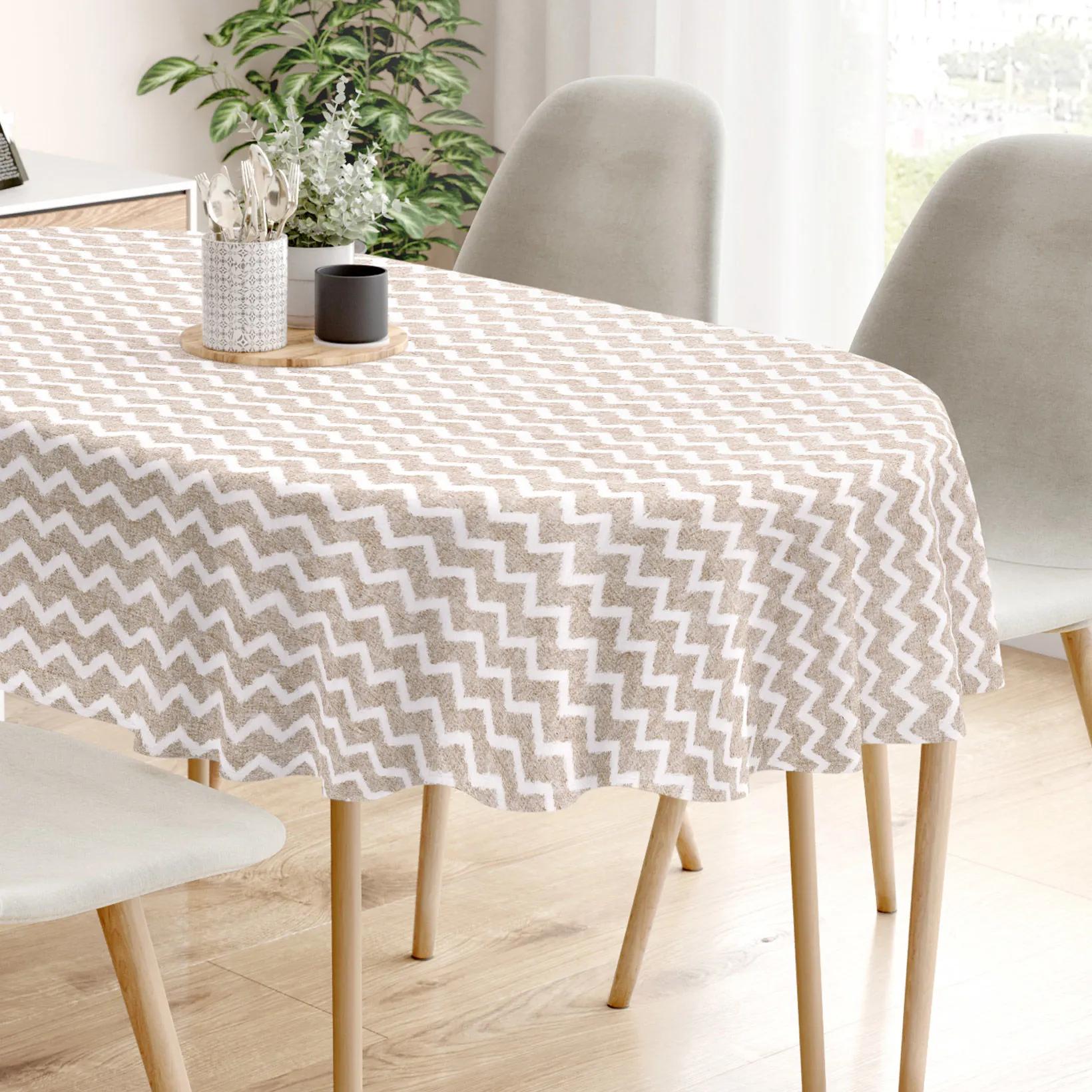 Kvalitný dekoračný oválny obrus s motívom cik-cak prúžkov na režnom. Je vyrobený z veľmi kvalitnej a pevnej španielskej látky Loneta (55% bavlna, 45% polyester). Obrus veľmi dobre drží tvar a hodí sa na akýkoľvek oválny stôl. Obrus s motívom cik-cak prúžkov dokonale skrášli Váš interiér.