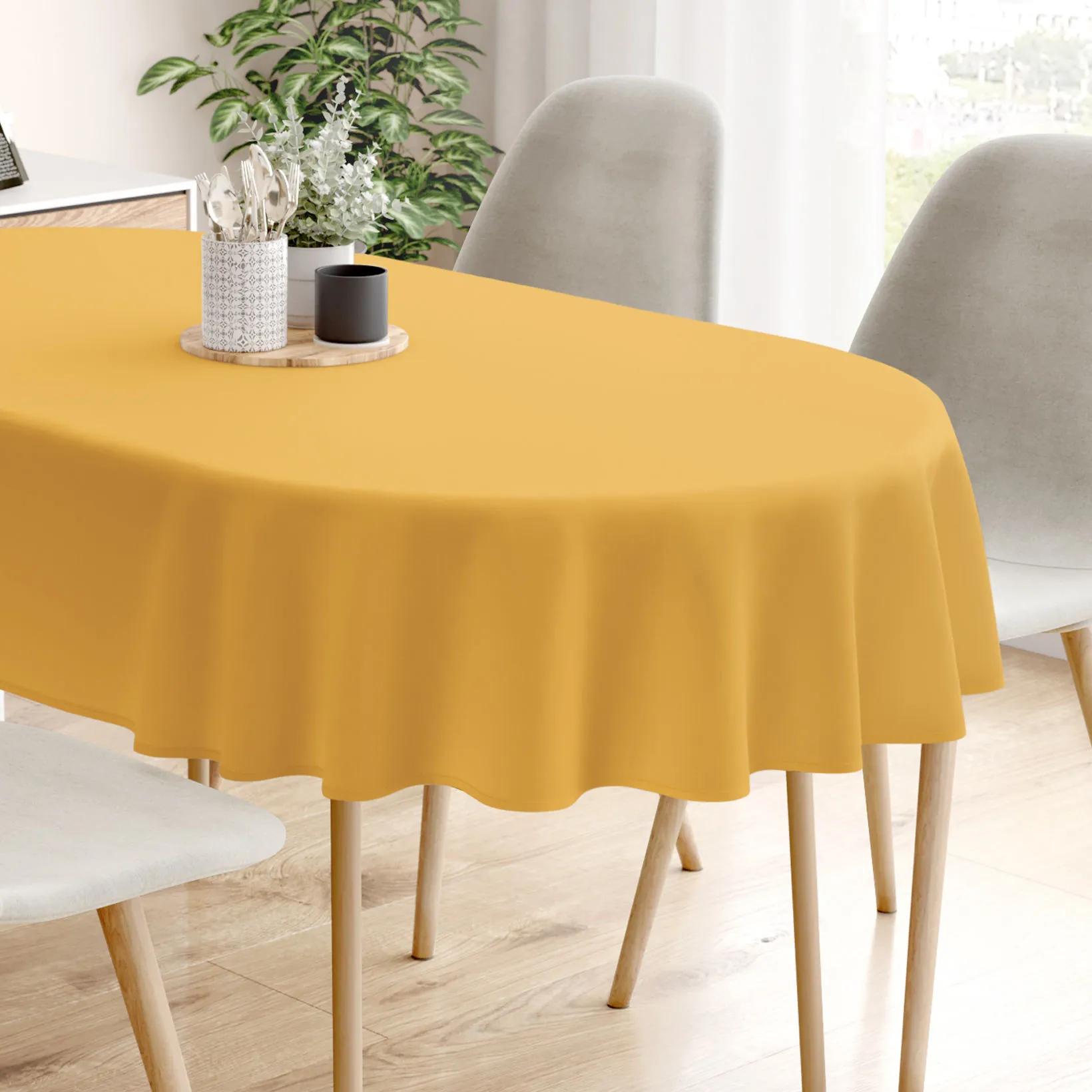 Kvalitný dekoračný oválny obrus v horčicovom prevedení. Je vyrobený z veľmi kvalitnej a pevnej španielskej látky Loneta (55% bavlna, 45% polyester). Obrus veľmi dobre drží tvar a hodí sa na akýkoľvek oválny stôl. Obrus v horčicovom prevedení dokonale skrášli Váš interiér.