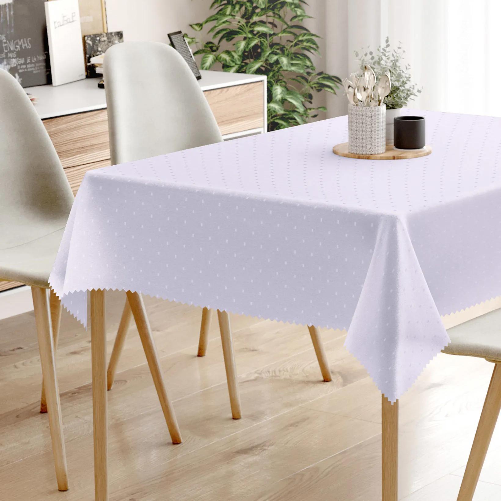 Luxusný teflónový obrus v bielej farbe s fialovým nádychom ozdobený lesklými obdĺžničkami. Je vyhotovený z dekoračnej látky s teflónovou úpravou zo 100% polyesteru (gramáž 220g/m2). Obrus veľmi dobre drží tvar a hodí sa na akýkoľvek hranatý stôl. Vďaka teflónovej úprave vyliata tekutina nevsiakne do obrusu a zostane len na povrchu vo forme kvapiek. Obrus je odolný voči škvrnám – je ľahko umývateľný. Nečistoty stačí iba zotrieť vlhkou handričkou. Obrus s ozdobnými lesklými obdĺžničkami dokonale skrášli Váš interiér.