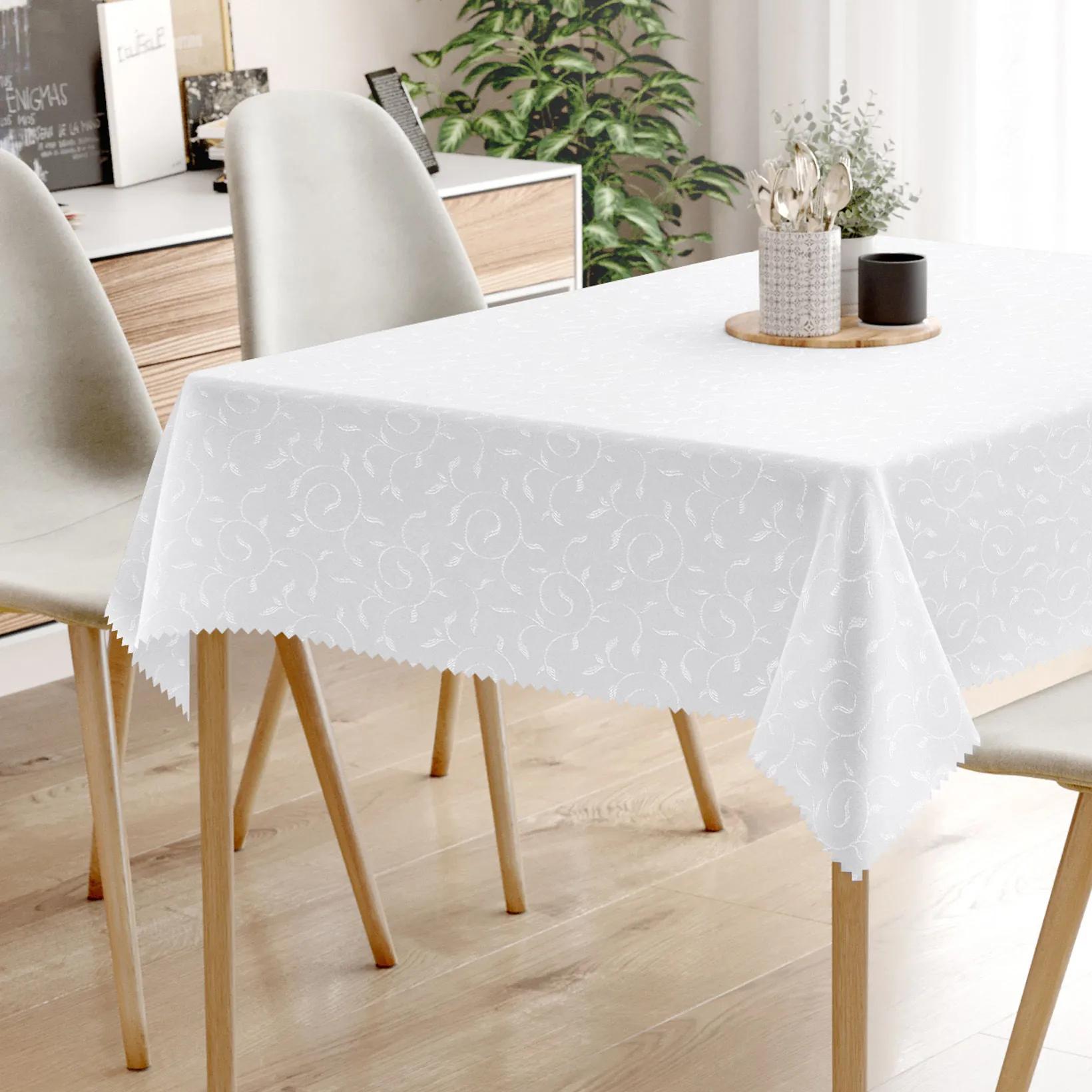 Luxusný teflónový obrus v bielej farbe s veľkými ornamentami. Je vyhotovený z dekoračnej látky s teflónovou úpravou zo 100% polyesteru (gramáž 200g/m2). Obrus veľmi dobre drží tvar a hodí sa na akýkoľvek hranatý stôl. Vďaka teflónovej úprave vyliata tekutina nevsiakne do obrusu a zostane len na povrchu vo forme kvapiek. Obrus je odolný voči škvrnám – je ľahko umývateľný. Nečistoty stačí iba zotrieť vlhkou handričkou. Obrus s veľkými ornamentami dokonale skrášli Váš interiér.