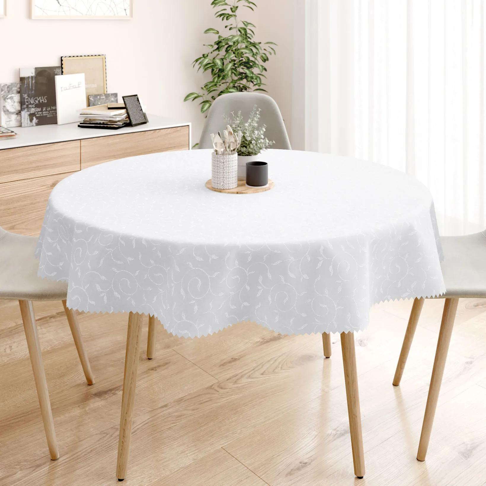 Luxusný teflónový okrúhly obrus v bielej farbe s veľkými ornamentami. Je vyhotovený z dekoračnej látky s teflónovou úpravou zo 100% polyesteru (gramáž 200g/m2). Obrus veľmi dobre drží tvar a hodí sa na akýkoľvek okrúhly stôl. Vďaka teflónovej úprave vyliata tekutina nevsiakne do obrusu a zostane len na povrchu vo forme kvapiek. Obrus je odolný voči škvrnám – je ľahko umývateľný. Nečistoty stačí iba zotrieť vlhkou handričkou. Obrus s veľkými ornamentami dokonale skrášli Váš interiér.