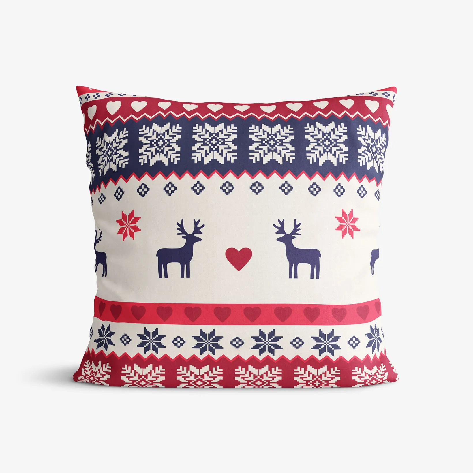 Bavlnená obliečka na vankúš s nórskym motívom sobov, vločiek a srdiečok (z oboch strán rovnaký motív). Obliečka je vyrobená z kvalitnej a príjemnej 100% bavlny. Je vybavená praktickým zapínaním na zips.