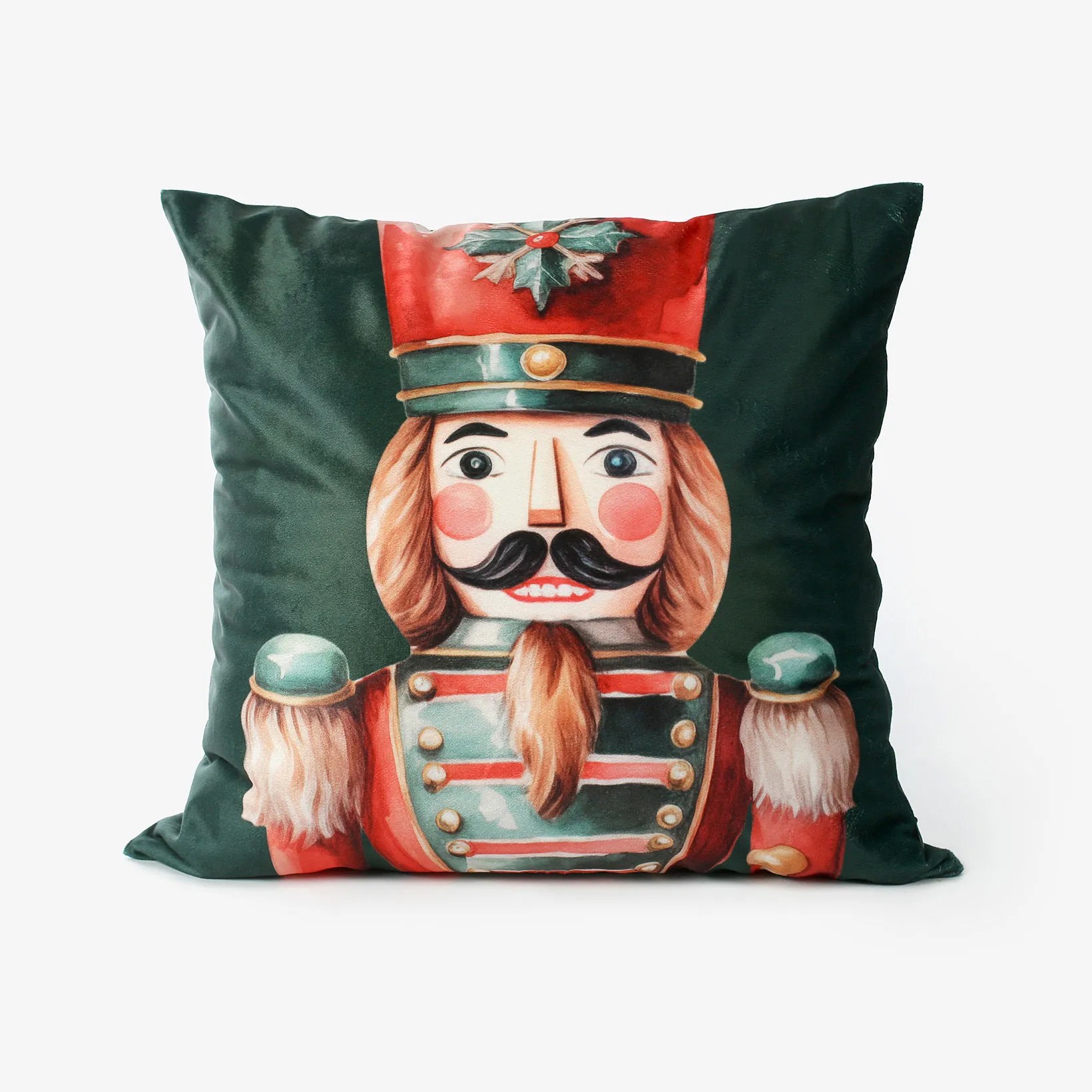 Zamatová obliečka na vankúš s krásnym vianočným motívom ozdobnej figúrky – luskáčika na tmavo zelenom. Obliečka je vyrobená z jemnej 100% polyesterovej látky. Vďaka tomu pôsobí zamatovým dojmom. Je príjemná a semišovo hebká na dotyk. Obliečka je vybavená praktickým zapínaním na zips. Možné prať na 40°C.