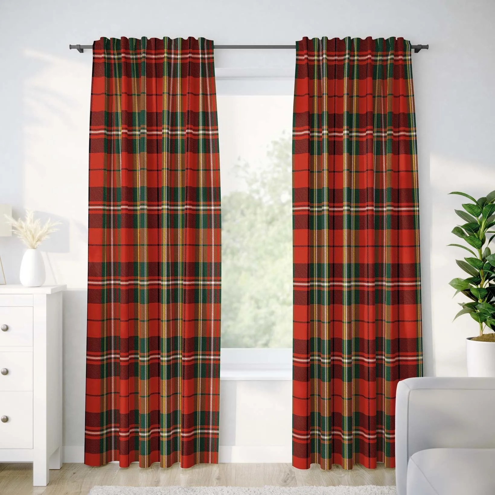 Vianočný bavlnený záves s motívom červeného kára. Tento záves šijeme z bavlneného plátna – červené káro o gramáži 145g/m2. Ide o husto tkané plátno zložené zo 100% bavlny. Záves má kvalitný jednostranný potlač a je výhradne určený na dekoračné účely (miestnosť zatieni, ale nezatemní).