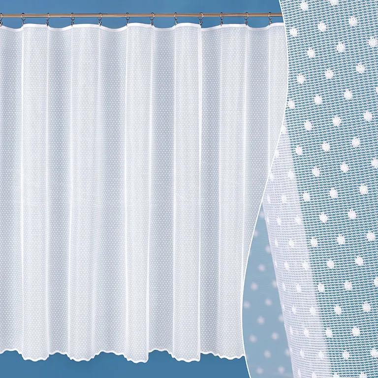 Kvalitná, žakárová, pletená, polyesterová záclona so vzorom bodiek. Je vyrobená zo 100% polyesterových vlákien. Navrchu má táto záclona pevný okraj pre uchytenie na štipce.
