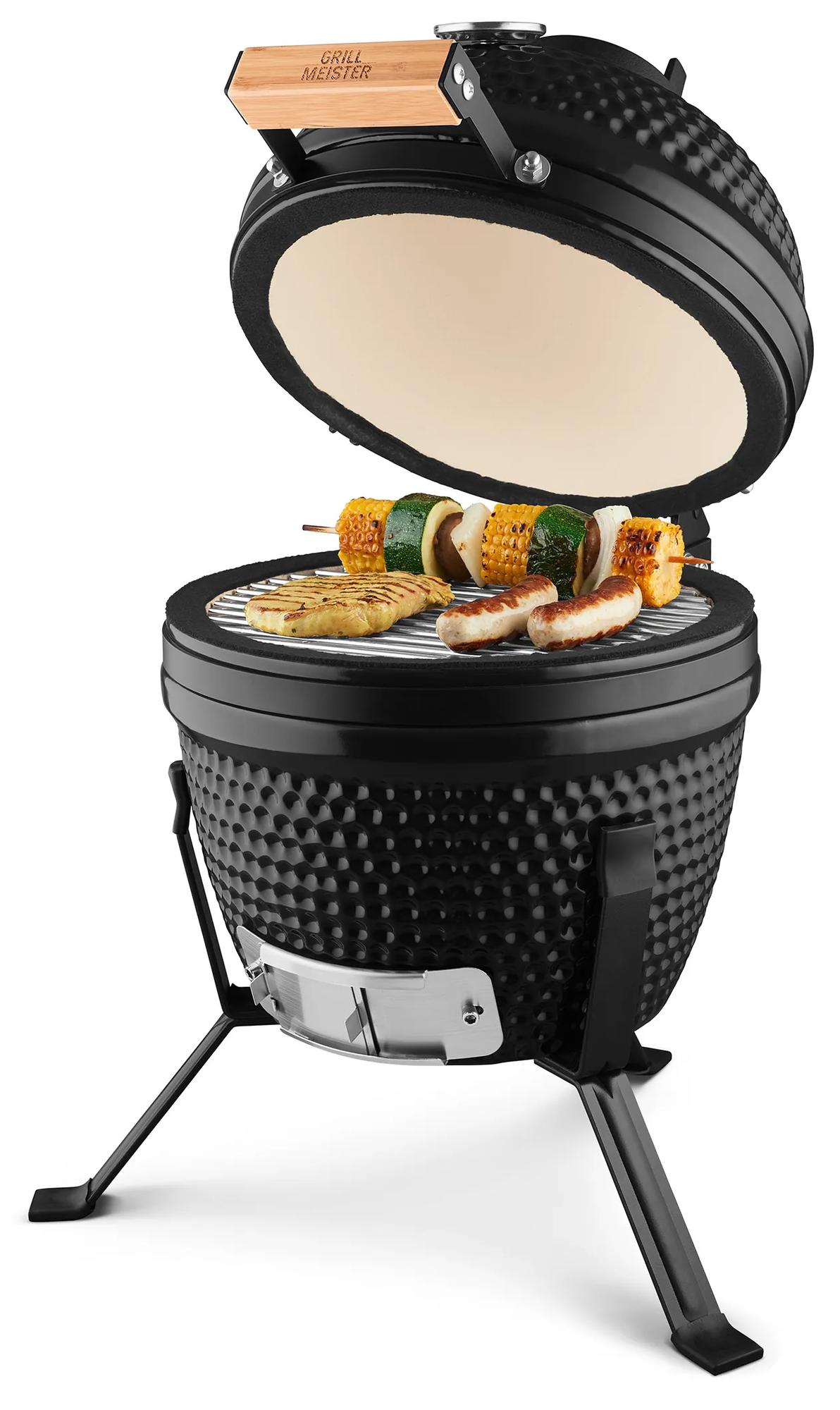 Nekonečná zábava pri grilovaní na najvyššej úrovni Kompaktný keramický gril na údenie; pečenie, grilovanie a vysokoteplotné varenie Vnútorný plášť varného priestoru a vložka ohňovej misy z kvalitnej keramiky pre optimálnu akumuláciu tepla Dosiahnuteľná teplota cca 50 až 450 °C pri rovnomernom, dlho pretrvávajúcom vyžarovaní tepla Jednoduchá obsluha s vetracou zarážkou ohňovej misy z nehrdzavejúcej ocele a s vetracou zarážkou veka z liatiny Pružinové výklopné veko s plsteným tesnením s dlhou životnosťou a pevným bambusovým držadlom Integrovaný teplomer so stupnicou v stupňoch a označenými stupňami varenia: Smoking (údenie) • Baking (pečenie) • Grilling (grilovanie) • Searing (vysokoteplotné varenie) Telo grilu z keramiky s odolnou smaltovanou vrstvou Grilovací rošt z ušľachtilej ocele s priemerom 26,5 cm Mriežka na uhlie z liatiny Nohy z ocele s práškovou farbou Vrátane návodu a montážneho materiálu Kapacita dreveného uhlia: ca. 0,6 kg Rozmery cca 43 x 56,5 x 49 cm (Š x V x H) Hmotnosť cca 23 kg Upozornenie Na podpaľovanie alebo opätovné podpaľovanie nepoužívajte lieh alebo benzín!
