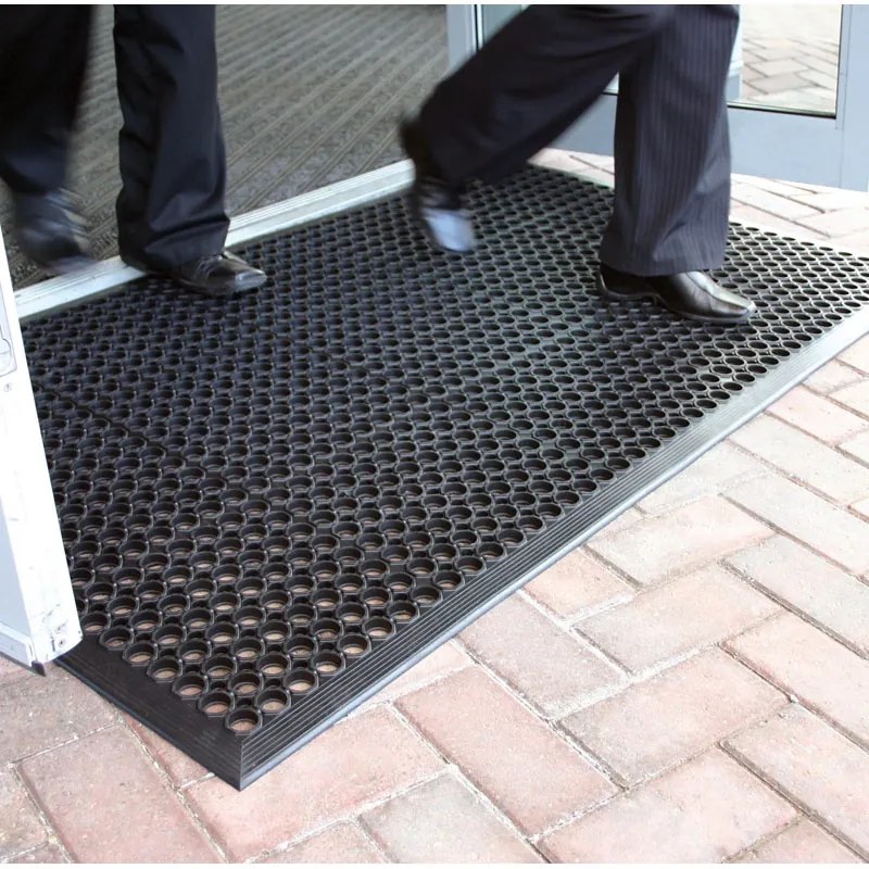 · vyvýšené otvory s odtokovými kanálikmi umožňujú odtok kvapalín a prepadávanie pevných častí, pričom povrch rohože zostáva suchý a čistý · čistiaca a protiúnavová rohož do priemyselných a reštauračných zariadení