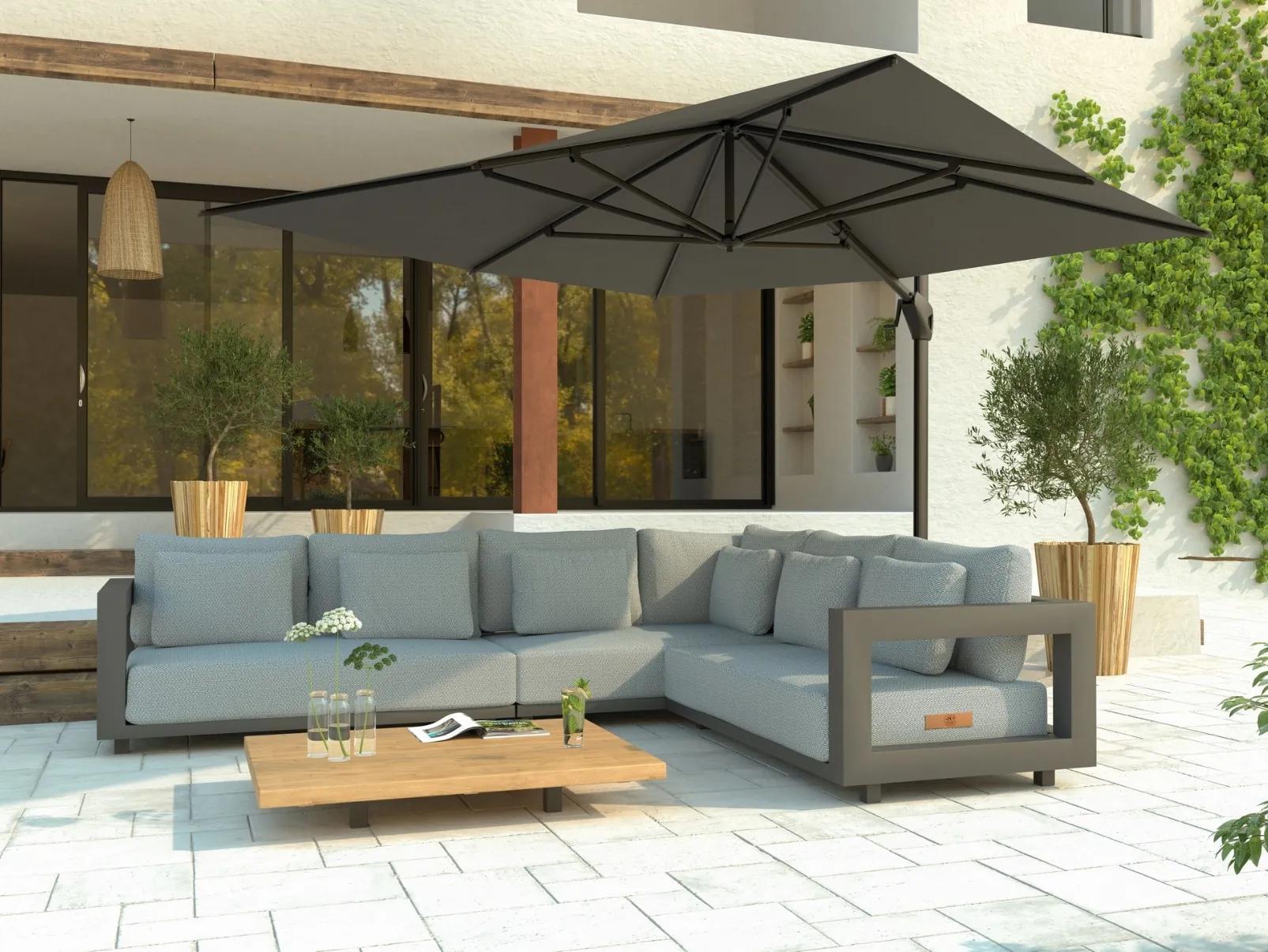Set súpravy Hacienda je kombináciou slnečníka, ochrannej plachty a stojanu na slnečník doplneného o kolieska k ľahšej manipulácii. Titulná fotka pri produkte je ilustračná, konštrukcia slnečníka je v hnedom sfarbení.