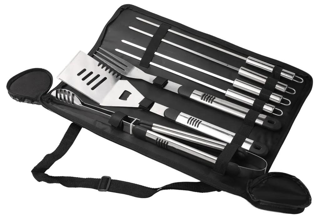 Kúpte si túto sadu náčinia v praktickej cestovnej taške. Obsahuje všetko, čo budete pre grilovanie potrebovať. Všetky nástroje majú ušká, môžete ich tak zavesiť.Sada obsahuje: