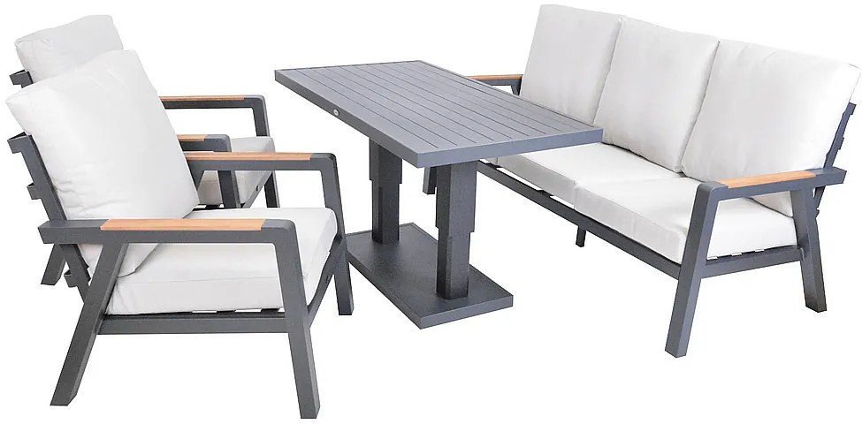 Elegantná zostava v antracitovom prevedení, doplnená o tíkové podrúčky a dosku stola. Moderná súprava, ktorá skvele zapadne do každého exteriéru alebo interiéru.