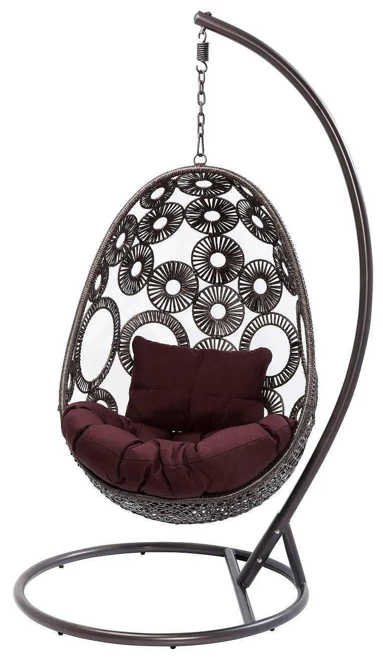 Štýlové závesné kreslo Ibiza v boho štýle s hnedým polyratanovým výpletom a lakovaným kovovým rámom pridáva do exteriéru aj interiéru nezameniteľnú eleganciu a štýl.