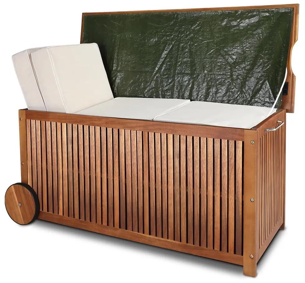 Priestranný drevený úložný box s kolieskami na odkladanie sedákov, hračiek a ďalších potrieb na vašej záhrade. Vďaka kolieskam a prepravnej rukoväti je možné úložný box ľahko presúvať.