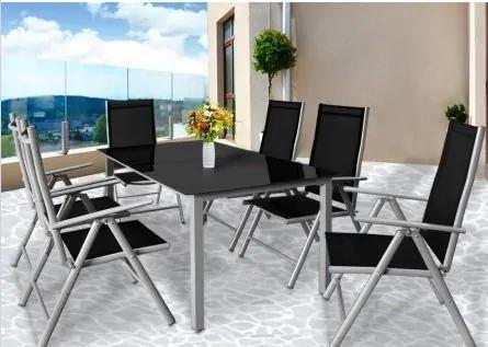 Exkluzívna, 7-dielna hliníková záhradná zostava so stolovou doskou z vysoko odolného bezpečnostného skla, polohovateľné stoličky (7 polohách) nastaviteľná výška na chrbát . Táto elegantná hliníková zostava pozostáva z 1 x stôl (150 cm) a 6x polohovateľných a skladacích stoličiek s operadlom. Všetky rúry a vzpery tejto zostavy sú vyrobené z hliníka . Dokonca aj skrutky sú vyrobené z nehrdzavejúcej ocele . To robí túto sedaciu záhradnú zostavu mimoriadne odolnú voči vplyvom počasia. Sklenená doska stola je rozdelená na 2 častí a skladá sa z 5 mm hrubého a vysoko pevného bezpečnostného skla. Stoličky sú v širokej verzii a operadlá sú polohovateľné v 7 bodoch sklápania. Nohy stola sú vybavené vyrovnávacími skrutkami a preto je možnosť ich prispôsobiť individuálnym výškovým rozdielom. Poťahy stoličiek sú vyrobené z odolnej, ľahko udržiavateľnej a umývateľnej textilnej syntetickej tkaniny.