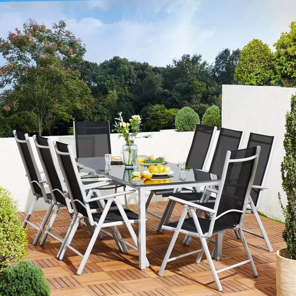 Exkluzívne hliníkové záhradné sedenie pre 8 osôb. Táto elegantná hliníková sedacia zostava pozostáva z 1 stola a 8 skladacích stoličiek s vysokým nastaviteľným operadlom. Na rozdiel od iných sedacích zostav sú všetky trubky a vzpery v tejto súprave vyrobené z hliníka. Dokonca aj skrutky sú vyrobené z nehrdzavejúcej ocele , vďaka čomu je táto súprava mimoriadne odolná voči poveternostným vplyvom.