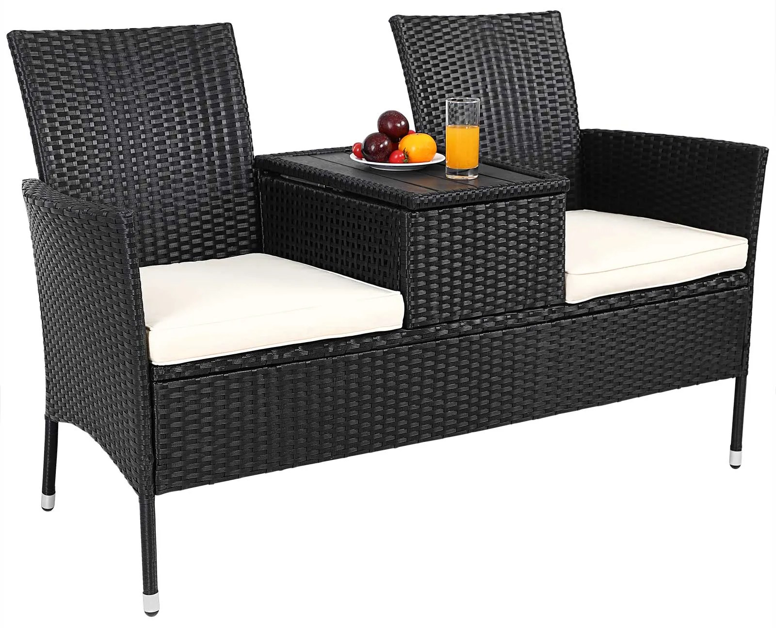 Polyratanová záhradná lavička prináša štýl a eleganciu do vášho vonkajšieho priestoru. S moderným, nadčasovým dizajnom a precíznou, ručne tkanou polyratanovou väzbou vynikne svojím estetickým prevedením. Špeciálnym prvkom je zabudovaný stolík s praktickým úložným priestorom v strede lavice, ktorý sa otvorením dosky stola jednoducho sprístupní. Rám z odolnej ocele s práškovým nástrekom unesie až 160 kg na každú stranu. Podsedáky sú nielen pohodlné, ale aj vodoodpudivé, odnímateľné a ľahko umývateľné . Polyratan, pevné a rovnomerne vinuté plastové vlákno, ktoré bolo špeciálne navrhnuté pre záhradný nábytok. Vyznačuje sa odolnosťou voči poveternostným vplyvom , UV žiareniu, odpudzuje nečistoty a je nenáročný na údržbu.