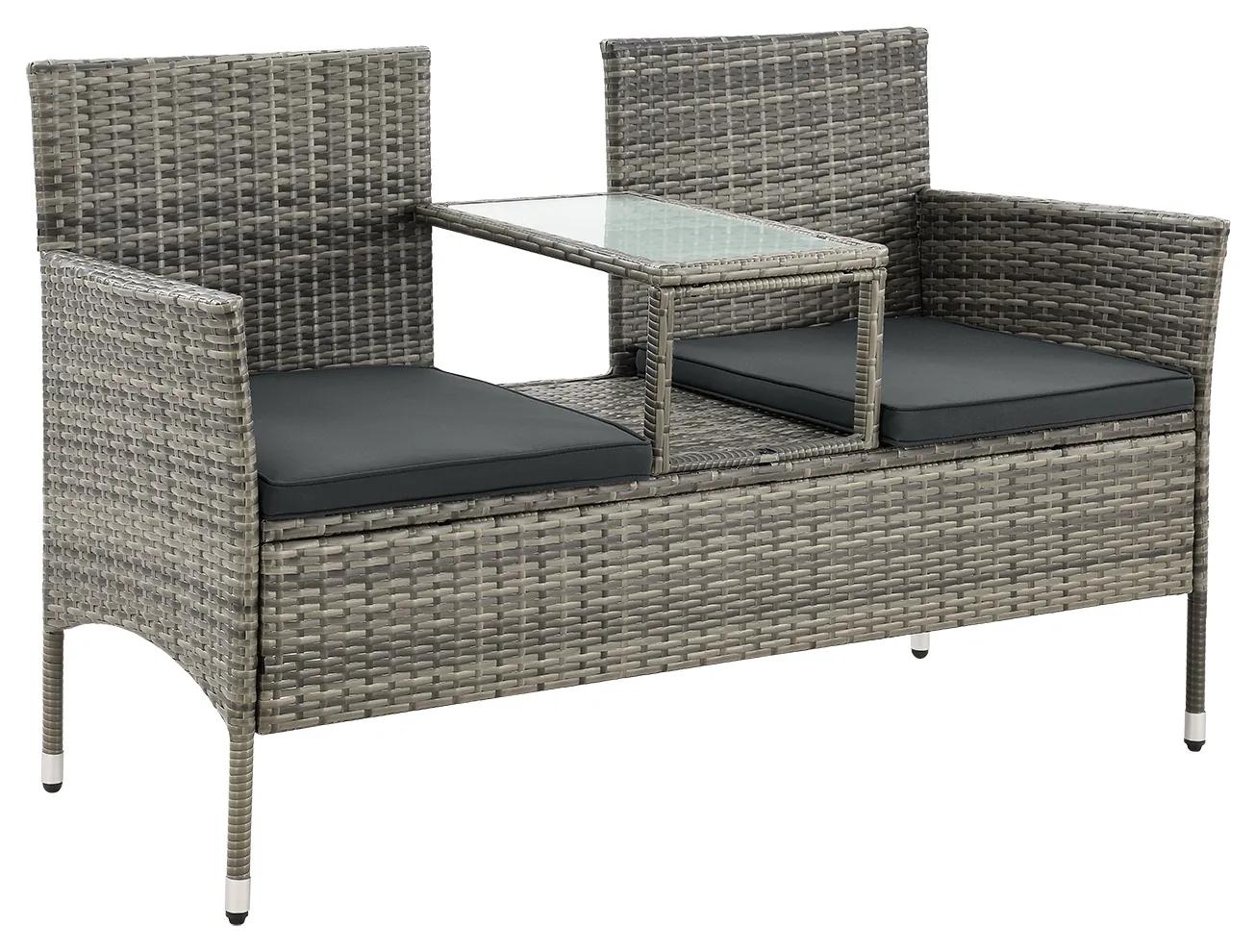 Moderná polyratanová lavica Monaco v šedej melírovanej farbe s tmavosivými podúškami vás zaujme svojím vzhľadom. Malá záhradná lavica pre 2 osoby zaberá vonku málo miesta (133 × 63 × 84 cm), a je preto ideálna aj ako balkónový nábytok. Robustný rám vyrobený z ocele s práškovým nástrekom zaručuje, že dvojsedadlová lavica stojí bezpečne. Napriek vysokej stabilite je záhradná lavica mimoriadne ľahká. To znamená, že set šetriaci miesto sa dá v záhrade kedykoľvek ľahko premiestniť. Sedacia súprava je vybavená mäkkými poťahmi ktoré sa dajú rýchlo stiahnuť pomocou zipsu. Podľa potreby ich teda periete na 30 stupňoch. Medzi dvoma miestami je malý príručný stolík s 5 mm stabilnou sklenenou doskou. Tu si môžete dať chladivý nápoj na teplý letný deň.